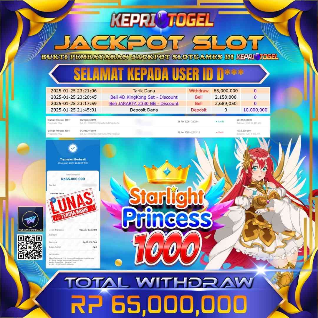 Selamat kepada UserId D*** telah berhasil mendapatkan kemenangan jackpot pada permainan Slot Starlight Princess 1000 Kepritogel sebesar Rp65,000,000,- . Kepritogel situs terpercaya sejak dulu hingga saat ini , Untuk kemenangan berapapun pasti akan kami bayarkan . Jangan ragu bermain di Kepri Togel . Kami pihak Kepritogel Menyampaikan terima kasih kepada seluruh member Kepri Togel yang telah Percaya dan setia Bersama kami bermain di Kepritogel hingga saat ini.