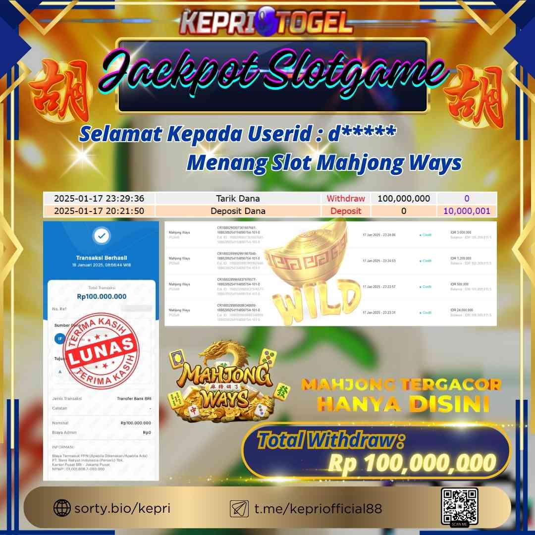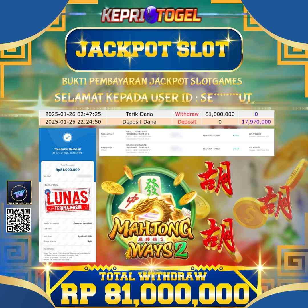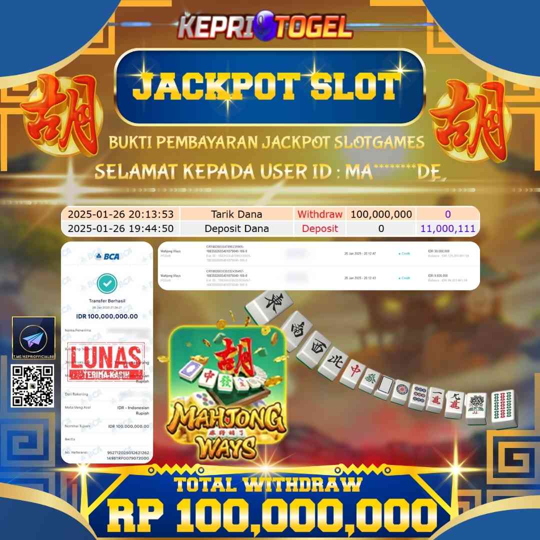 Selamat kepada UserId MA********DE telah berhasil mendapatkan kemenangan jackpot pada permainan Slot Mahjong Ways Kepritogel sebesar Rp100,000,000,- . Kepritogel situs terpercaya sejak dulu hingga saat ini , Untuk kemenangan berapapun pasti akan kami bayarkan . Jangan ragu bermain di Kepri Togel . Kami pihak Kepritogel Menyampaikan terima kasih kepada seluruh member Kepri Togel yang telah Percaya dan setia Bersama kami bermain di Kepritogel hingga saat ini.