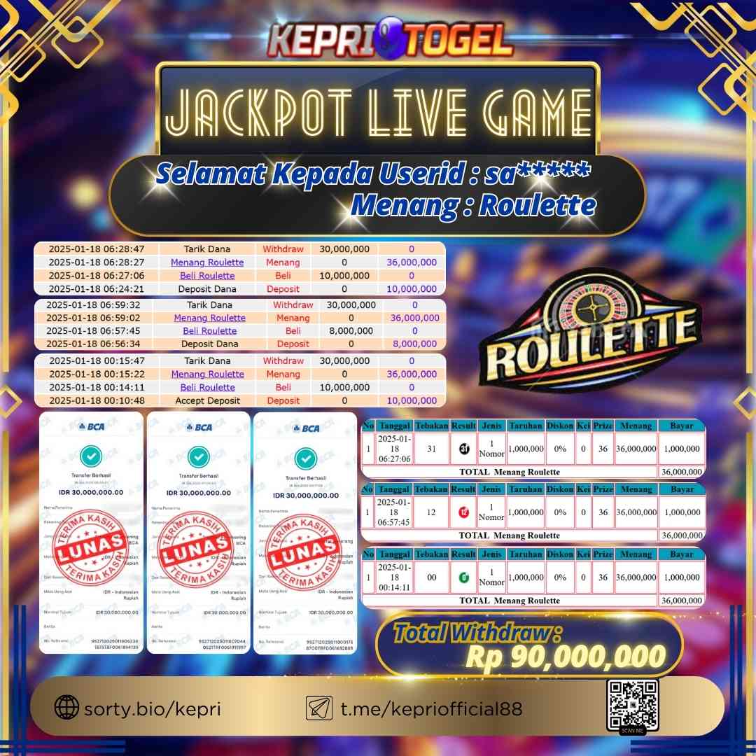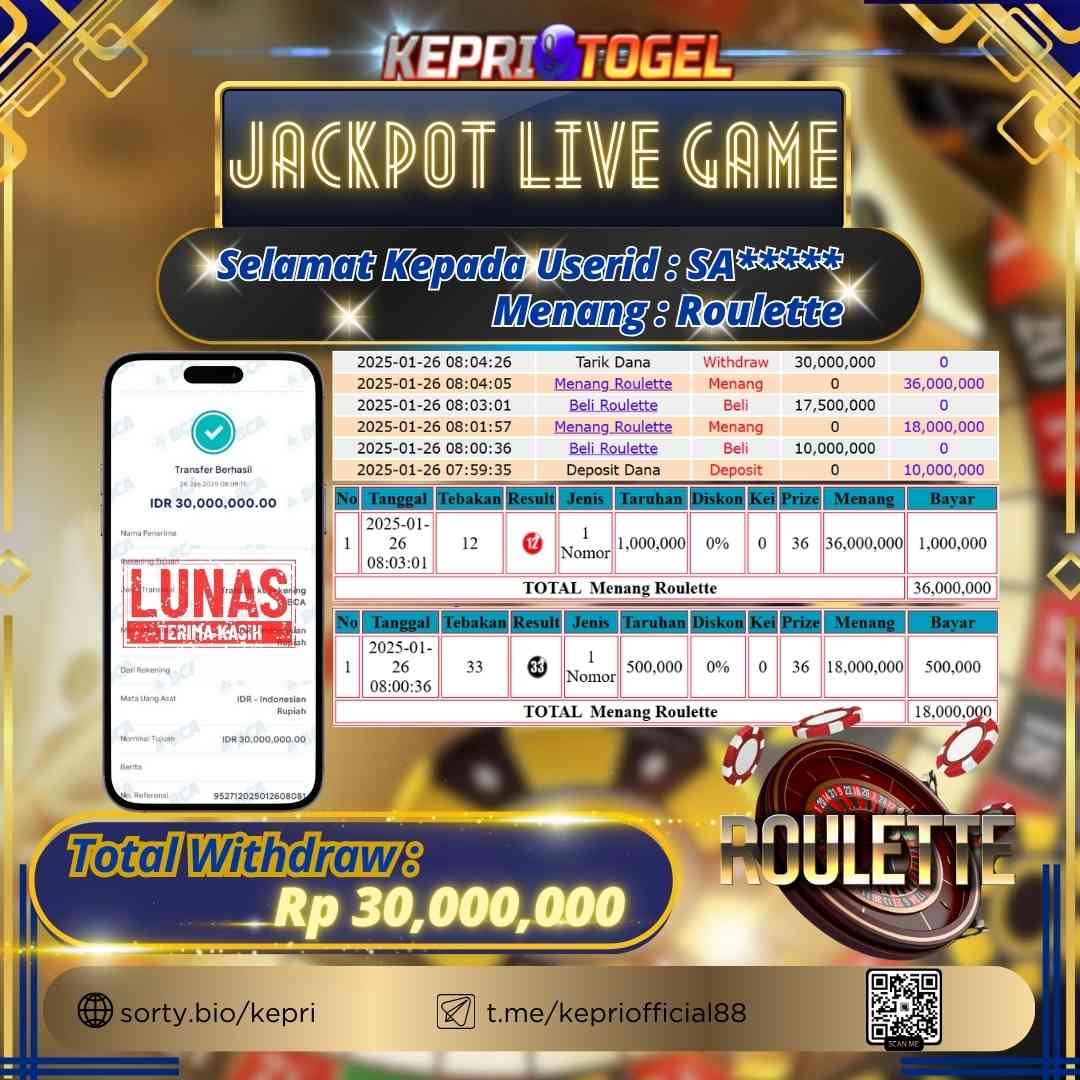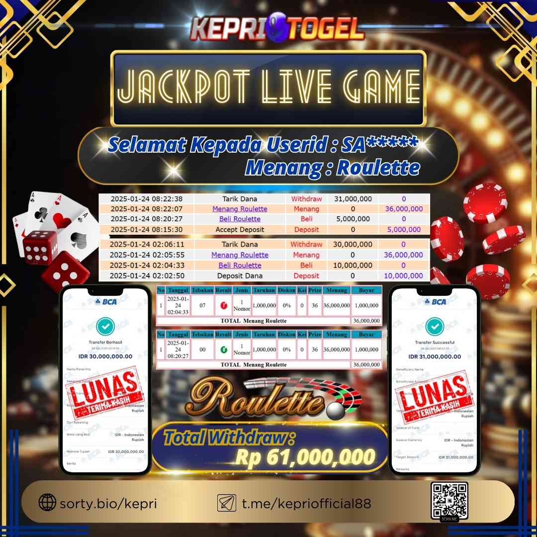 Selamat kepada UserId SA***** telah berhasil mendapatkan kemenangan jackpot pada permainan Live Game Roulette Kepritogel sebesar Rp30,000,000,- . Kepritogel situs terpercaya sejak dulu hingga saat ini , Untuk kemenangan berapapun pasti akan kami bayarkan . Jangan ragu bermain di Kepri Togel . Kami pihak Kepritogel Menyampaikan terima kasih kepada seluruh member Kepri Togel yang telah Percaya dan setia Bersama kami bermain di Kepritogel hingga saat inI.