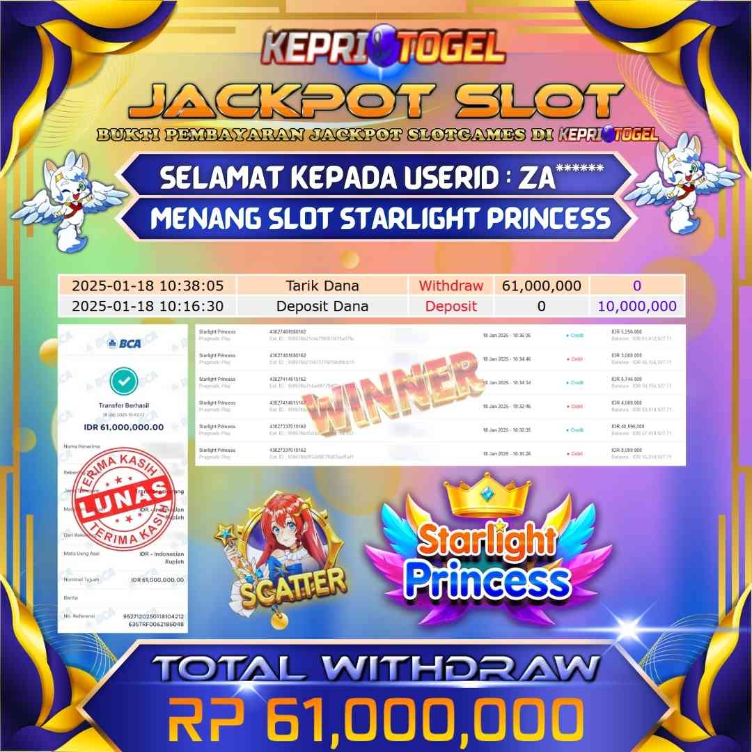 Selamat kepada UserId ZA****** telah berhasil mendapatkan kemenangan jackpot pada permainan Slot Starlight Princess Kepritogel sebesar Rp61,000,000,- . Kepritogel situs terpercaya sejak dulu hingga saat ini , Untuk kemenangan berapapun pasti akan kami bayarkan . Jangan ragu bermain di Kepri Togel . Kami pihak Kepritogel Menyampaikan terima kasih kepada seluruh member Kepri Togel yang telah Percaya dan setia Bersama kami bermain di Kepritogel hingga saat ini.