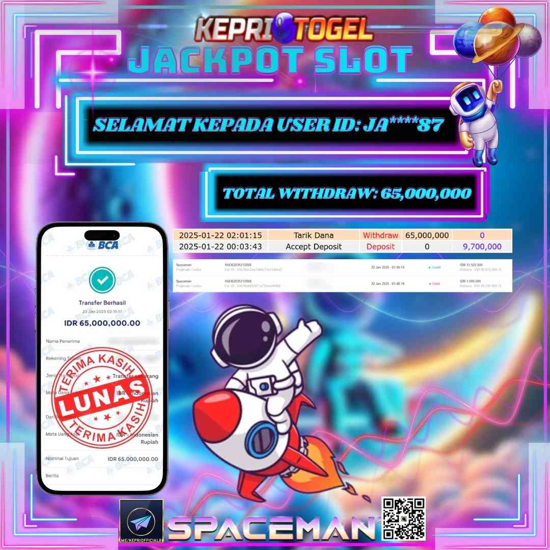 Selamat kepada UserId JA****87 telah berhasil mendapatkan kemenangan jackpot pada permainan Slot SPACEMAN Kepritogel sebesar Rp65,000,000,- . Kepritogel situs terpercaya sejak dulu hingga saat ini , Untuk kemenangan berapapun pasti akan kami bayarkan . Jangan ragu bermain di Kepri Togel . Kami pihak Kepritogel Menyampaikan terima kasih kepada seluruh member Kepri Togel yang telah Percaya dan setia Bersama kami bermain di Kepritogel hingga saat ini.
