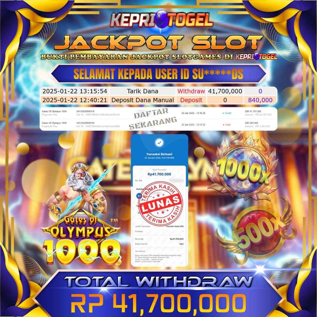 Selamat kepada UserId SU*****DS telah berhasil mendapatkan kemenangan jackpot pada permainan Slot Gates Of Olympus 1000 Kepritogel sebesar Rp41,700,000,- . Kepritogel situs terpercaya sejak dulu hingga saat ini , Untuk kemenangan berapapun pasti akan kami bayarkan . Jangan ragu bermain di Kepri Togel . Kami pihak Kepritogel Menyampaikan terima kasih kepada seluruh member Kepri Togel yang telah Percaya dan setia Bersama kami bermain di Kepritogel hingga saat ini.