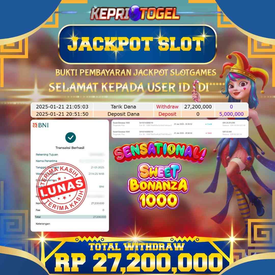 Selamat kepada UserId DI***** telah berhasil mendapatkan kemenangan jackpot pada permainan Slot Sweet Bonanza 1000 Kepritogel sebesar Rp27,200,000,- . Kepritogel situs terpercaya sejak dulu hingga saat ini , Untuk kemenangan berapapun pasti akan kami bayarkan . Jangan ragu bermain di Kepri Togel . Kami pihak Kepritogel Menyampaikan terima kasih kepada seluruh member Kepri Togel yang telah Percaya dan setia Bersama kami bermain di Kepritogel hingga saat ini.