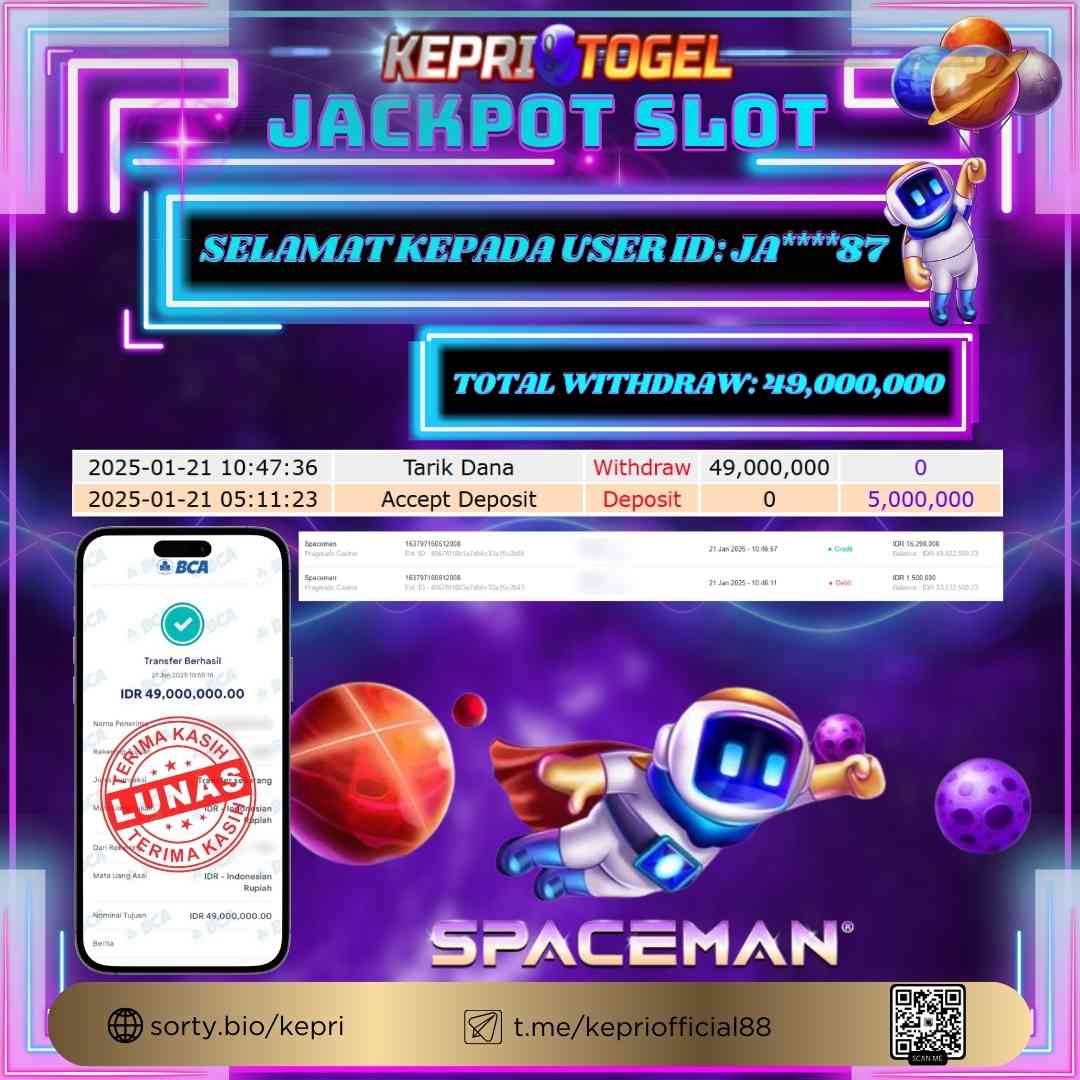 Selamat kepada UserId JA****87 telah berhasil mendapatkan kemenangan jackpot pada permainan Slot SPACEMAN Kepritogel sebesar Rp49,000,000,- . Kepritogel situs terpercaya sejak dulu hingga saat ini , Untuk kemenangan berapapun pasti akan kami bayarkan . Jangan ragu bermain di Kepri Togel . Kami pihak Kepritogel Menyampaikan terima kasih kepada seluruh member Kepri Togel yang telah Percaya dan setia Bersama kami bermain di Kepritogel hingga saat ini.