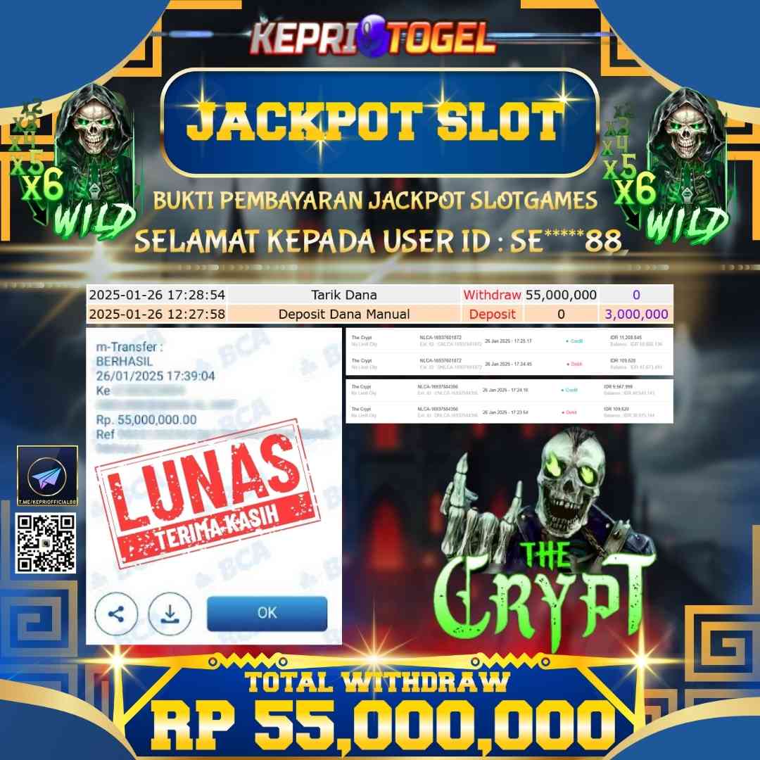 Selamat kepada UserId SE*****88 telah berhasil mendapatkan kemenangan jackpot pada permainan Slot The Crypt Kepritogel sebesar Rp55,000,000,- . Kepritogel situs terpercaya sejak dulu hingga saat ini , Untuk kemenangan berapapun pasti akan kami bayarkan . Jangan ragu bermain di Kepri Togel . Kami pihak Kepritogel Menyampaikan terima kasih kepada seluruh member Kepri Togel yang telah Percaya dan setia Bersama kami bermain di Kepritogel hingga saat ini.