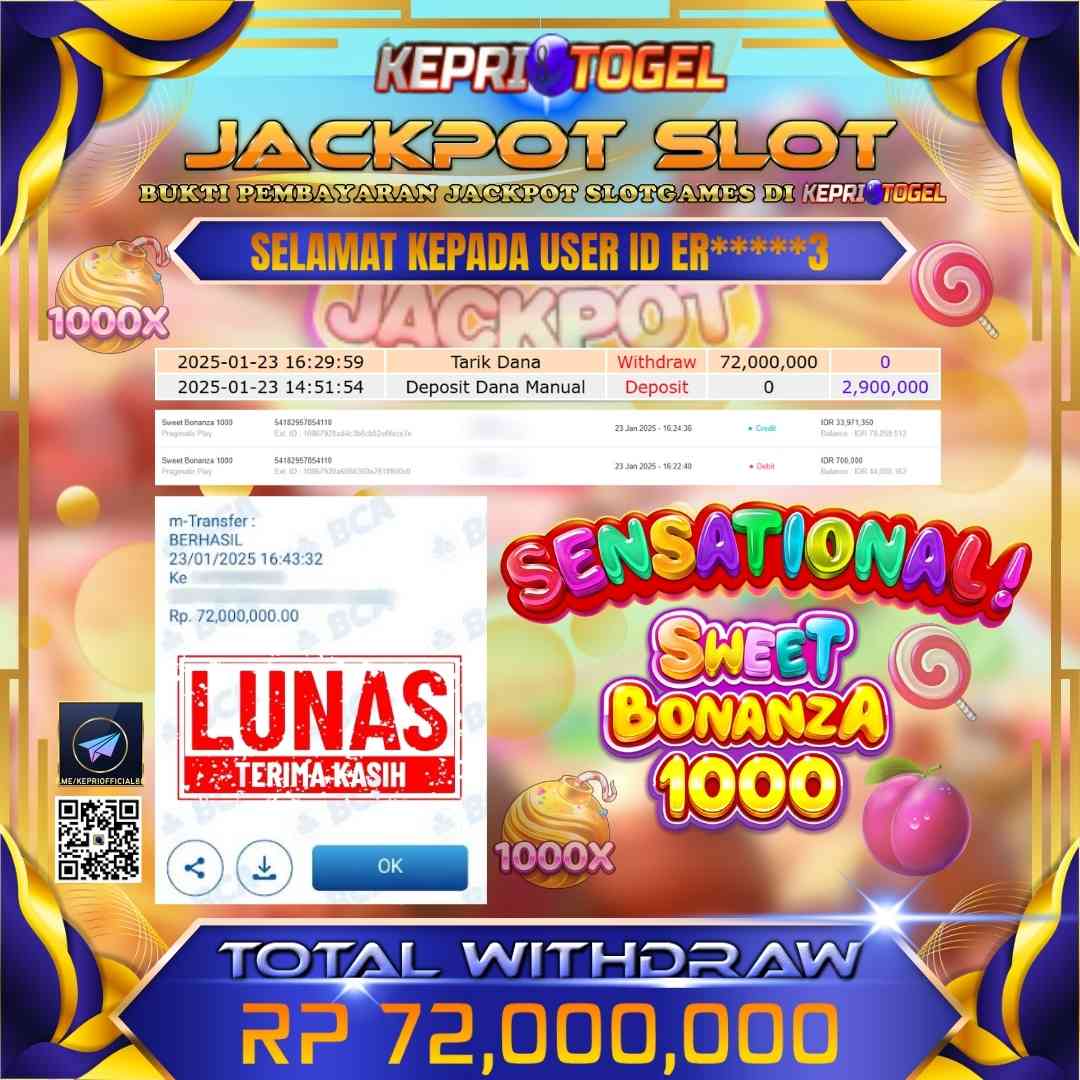 Selamat kepada UserId ER*****3 telah berhasil mendapatkan kemenangan jackpot pada permainan Slot Sweet Bonanza 1000 Kepritogel sebesar Rp72,000,000,- . Kepritogel situs terpercaya sejak dulu hingga saat ini , Untuk kemenangan berapapun pasti akan kami bayarkan . Jangan ragu bermain di Kepri Togel . Kami pihak Kepritogel Menyampaikan terima kasih kepada seluruh member Kepri Togel yang telah Percaya dan setia Bersama kami bermain di Kepritogel hingga saat ini.