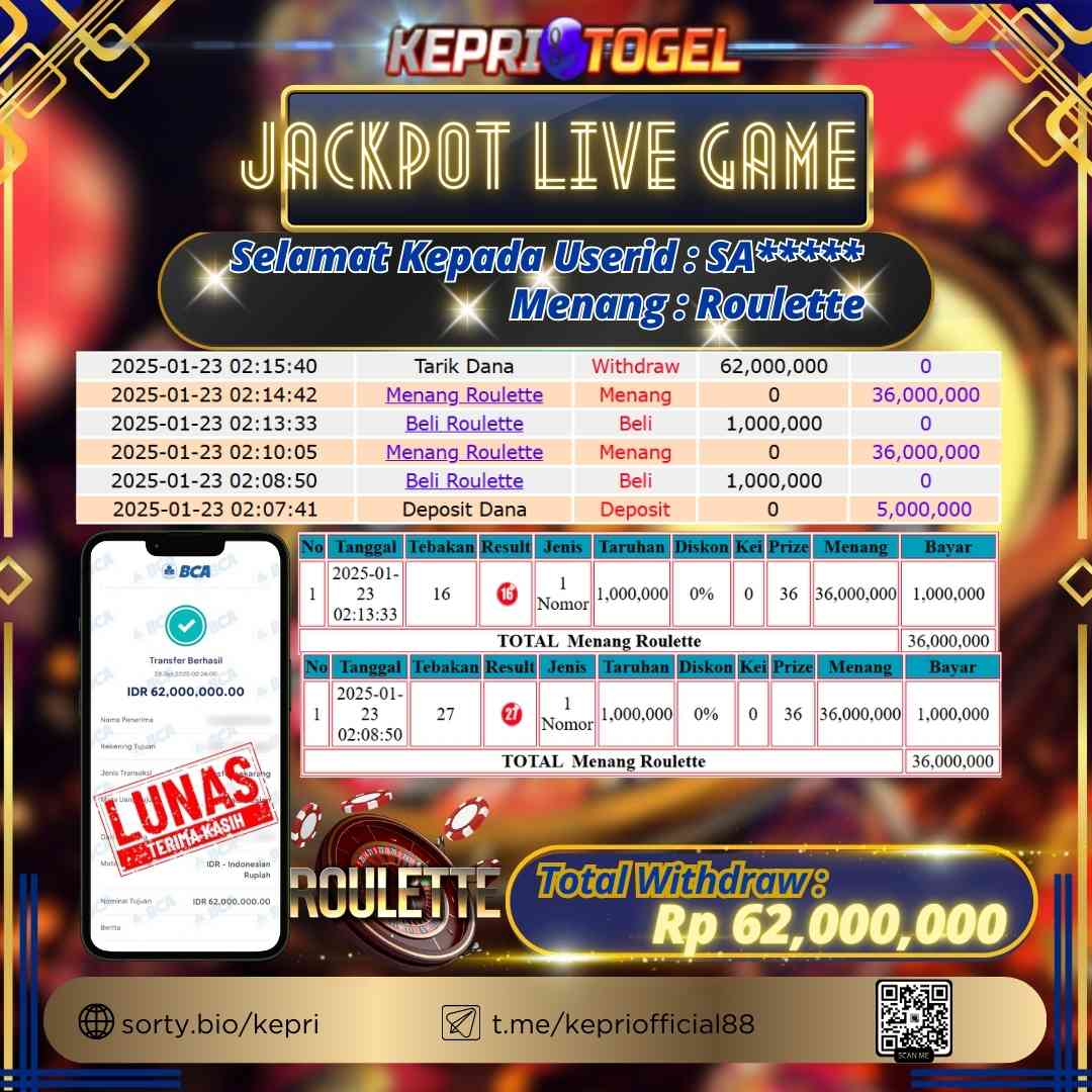 Selamat kepada UserId SA***** telah berhasil mendapatkan kemenangan jackpot pada permainan Live Game Roulette Kepritogel sebesar Rp62,000,000,- . Kepritogel situs terpercaya sejak dulu hingga saat ini , Untuk kemenangan berapapun pasti akan kami bayarkan . Jangan ragu bermain di Kepri Togel . Kami pihak Kepritogel Menyampaikan terima kasih kepada seluruh member Kepri Togel yang telah Percaya dan setia Bersama kami bermain di Kepritogel hingga saat inI.