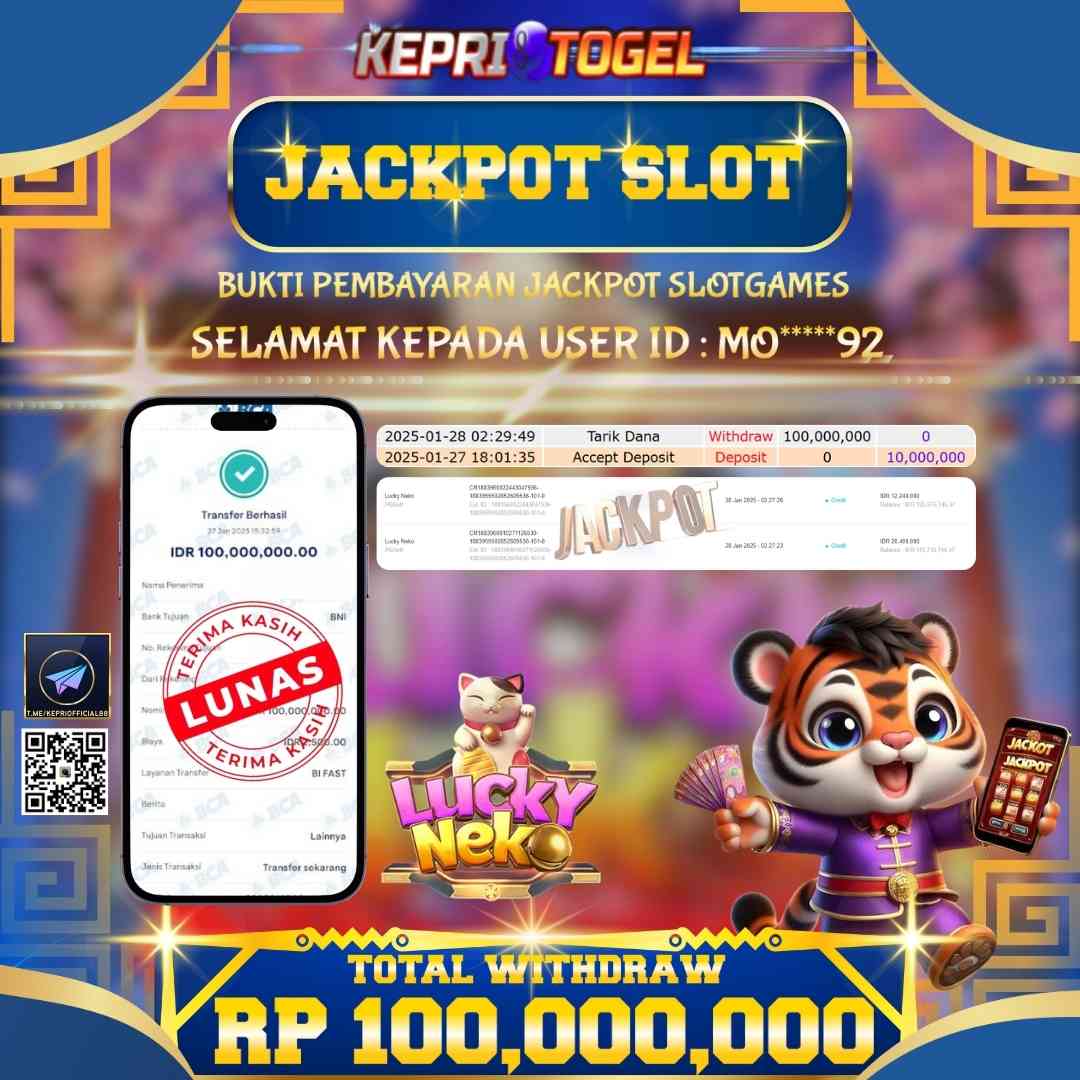 Selamat kepada UserId MO*****92 telah berhasil mendapatkan kemenangan jackpot pada permainan Slot Lucky Neko Kepritogel sebesar Rp100,000,000,- . Kepritogel situs terpercaya sejak dulu hingga saat ini , Untuk kemenangan berapapun pasti akan kami bayarkan . Jangan ragu bermain di Kepri Togel . Kami pihak Kepritogel Menyampaikan terima kasih kepada seluruh member Kepri Togel yang telah Percaya dan setia Bersama kami bermain di Kepritogel hingga saat ini.