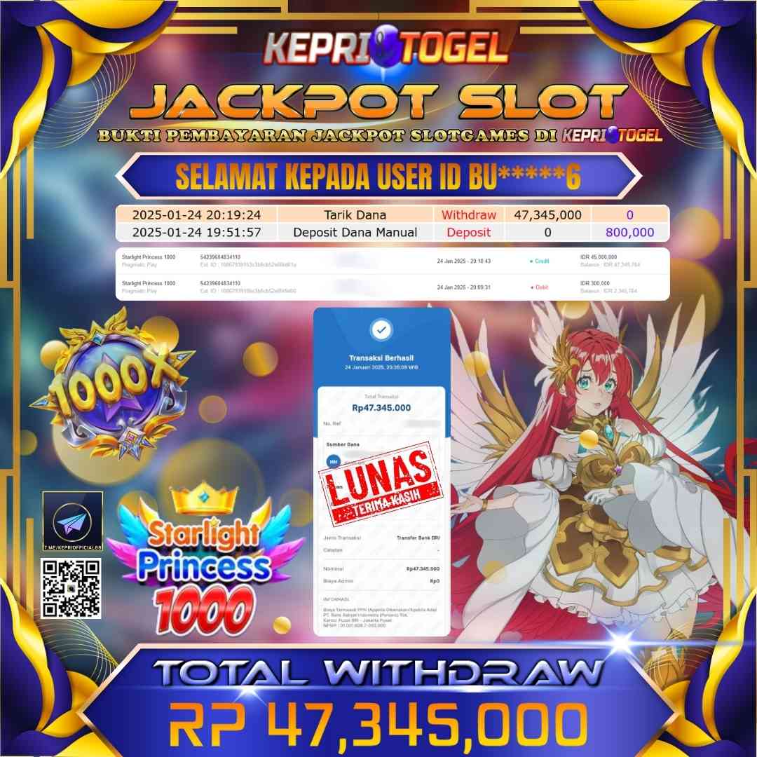Selamat kepada UserId BU*****6 telah berhasil mendapatkan kemenangan jackpot pada permainan Slot Starlight Princess 1000 Kepritogel sebesar Rp47,345,000,- . Kepritogel situs terpercaya sejak dulu hingga saat ini , Untuk kemenangan berapapun pasti akan kami bayarkan . Jangan ragu bermain di Kepri Togel . Kami pihak Kepritogel Menyampaikan terima kasih kepada seluruh member Kepri Togel yang telah Percaya dan setia Bersama kami bermain di Kepritogel hingga saat ini.