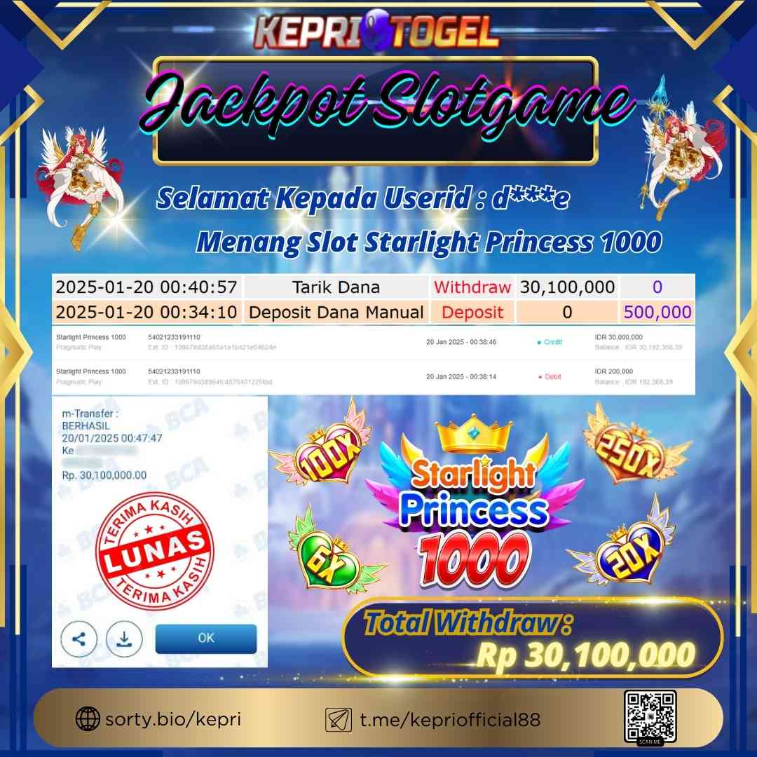 Selamat kepada UserId D***E telah berhasil mendapatkan kemenangan jackpot pada permainan Slot Game Starlight Princess 1000 Kepritogel sebesar Rp30,100,000,- . Kepritogel situs terpercaya sejak dulu hingga saat ini , Untuk kemenangan berapapun pasti akan kami bayarkan . Jangan ragu bermain di Kepri togel . Kami pihak Kepritogel Menyampaikan terima kasih kepada seluruh member Kepri togel yang telah Percaya dan setia Bersama kami bermain di Kepritogel hingga saat ini