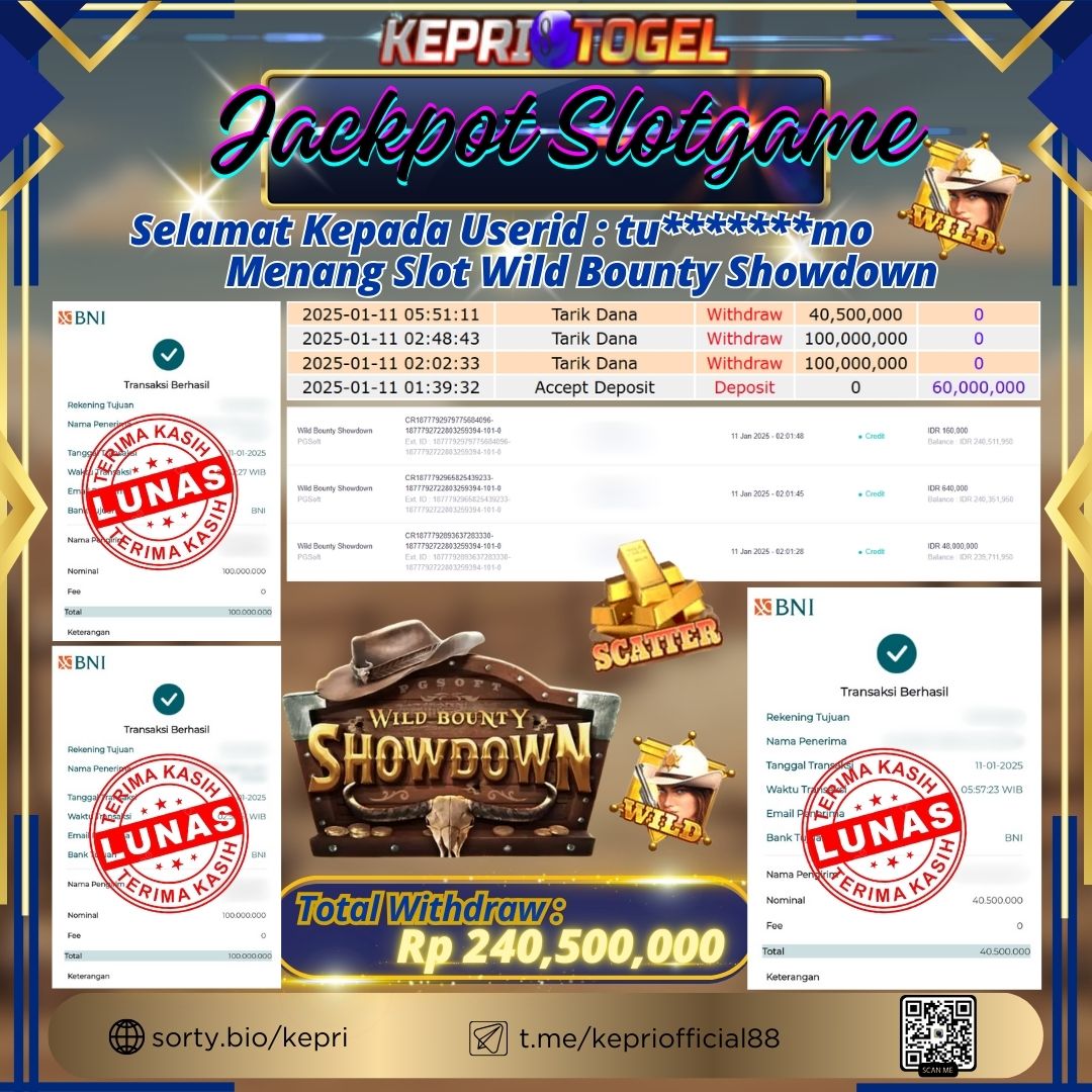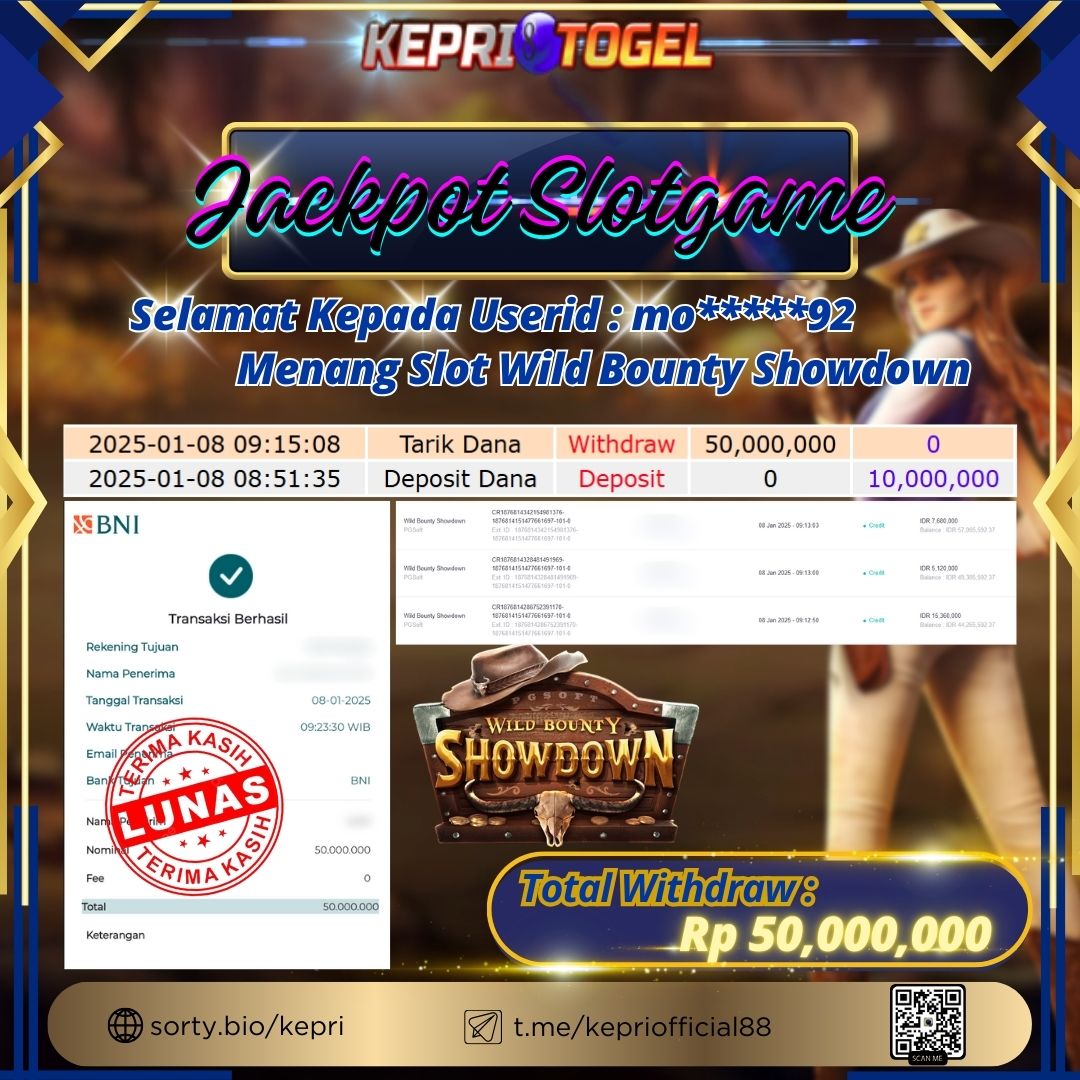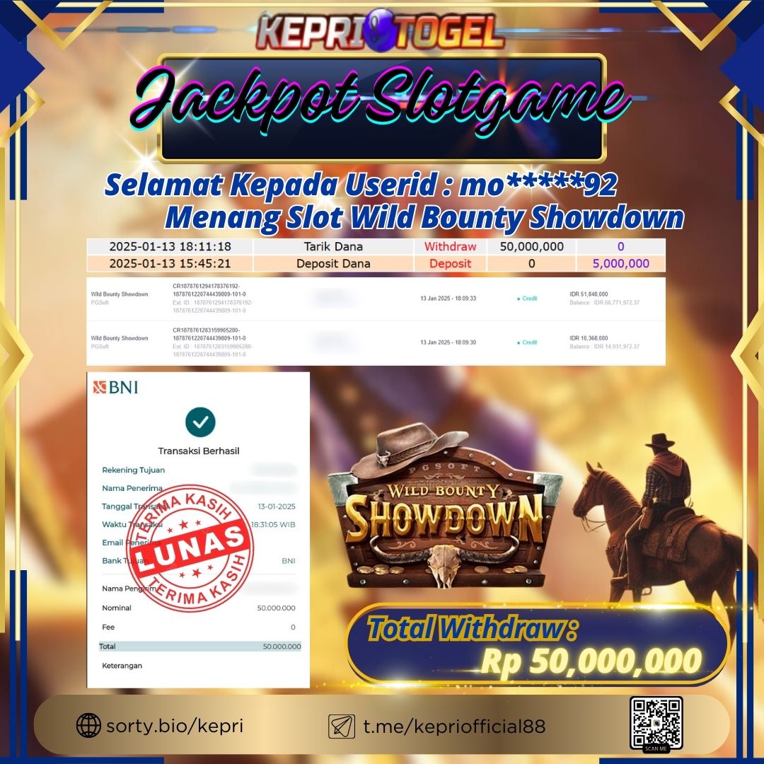 Selamat kepada UserId MO*****92 telah berhasil mendapatkan kemenangan jackpot pada permainan Slot Game Wild Bounty Showdown Kepritogel sebesar Rp50,000,000,- . Kepritogel situs terpercaya sejak dulu hingga saat ini , Untuk kemenangan berapapun pasti akan kami bayarkan . Jangan ragu bermain di Kepri Togel . Kami pihak Kepritogel Menyampaikan terima kasih kepada seluruh member Kepri Togel yang telah Percaya dan setia Bersama kami bermain di Kepritogel hingga saat ini.