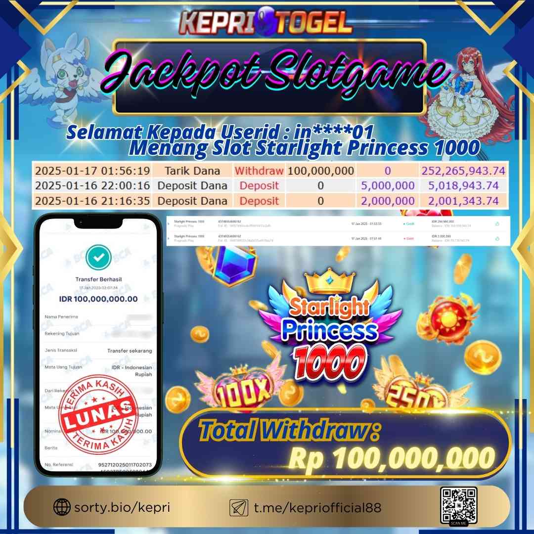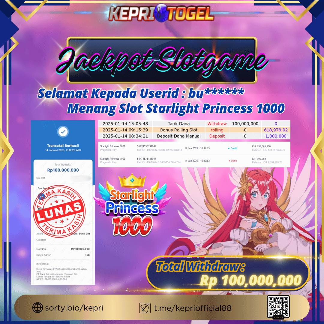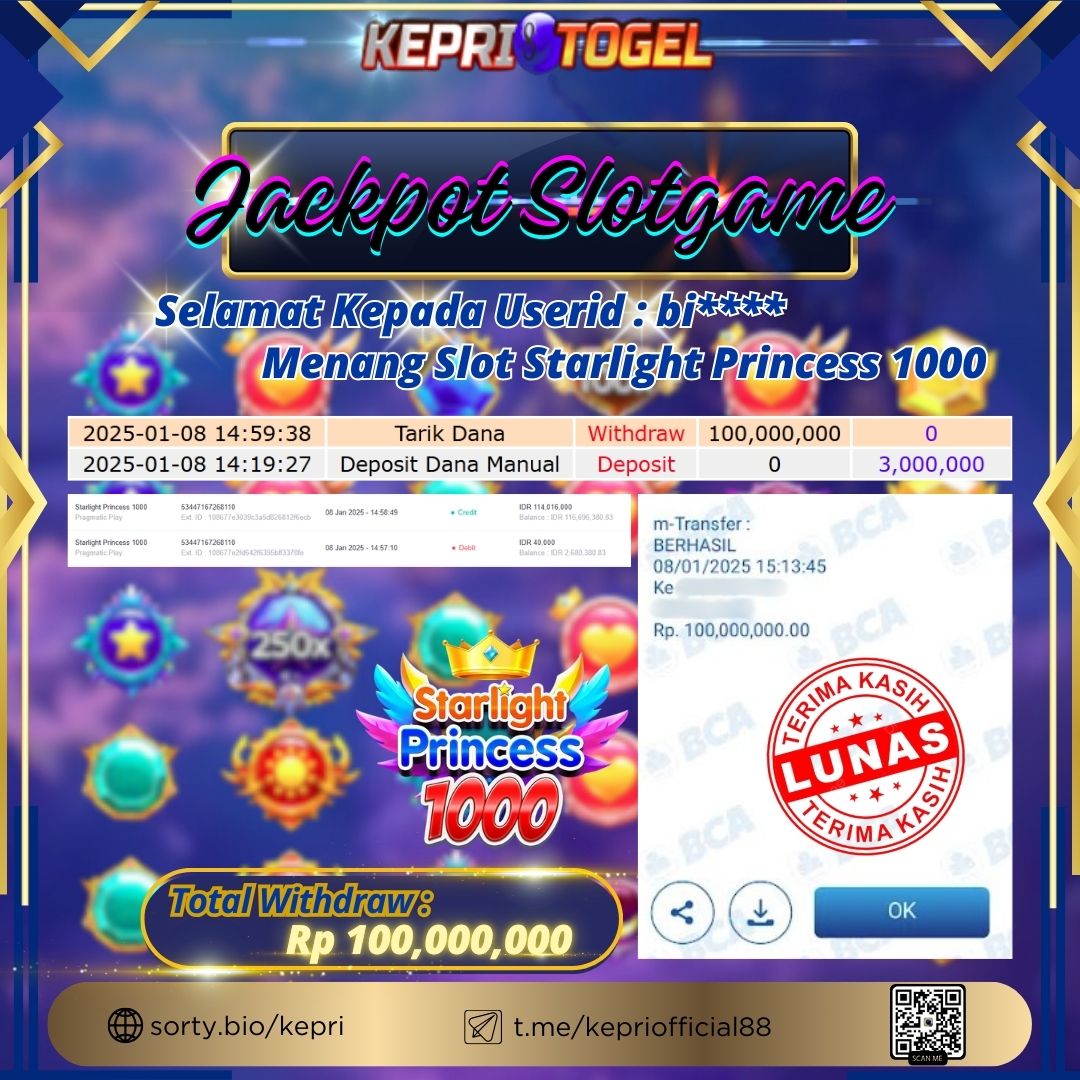 Selamat kepada UserId BU****** telah berhasil mendapatkan kemenangan jackpot pada permainan Slot Starlight Princess 1000 Kepritogel sebesar Rp100,000,000,- . Kepritogel situs terpercaya sejak dulu hingga saat ini , Untuk kemenangan berapapun pasti akan kami bayarkan . Jangan ragu bermain di Kepri Togel . Kami pihak Kepritogel Menyampaikan terima kasih kepada seluruh member Kepri Togel yang telah Percaya dan setia Bersama kami bermain di Kepritogel hingga saat ini.