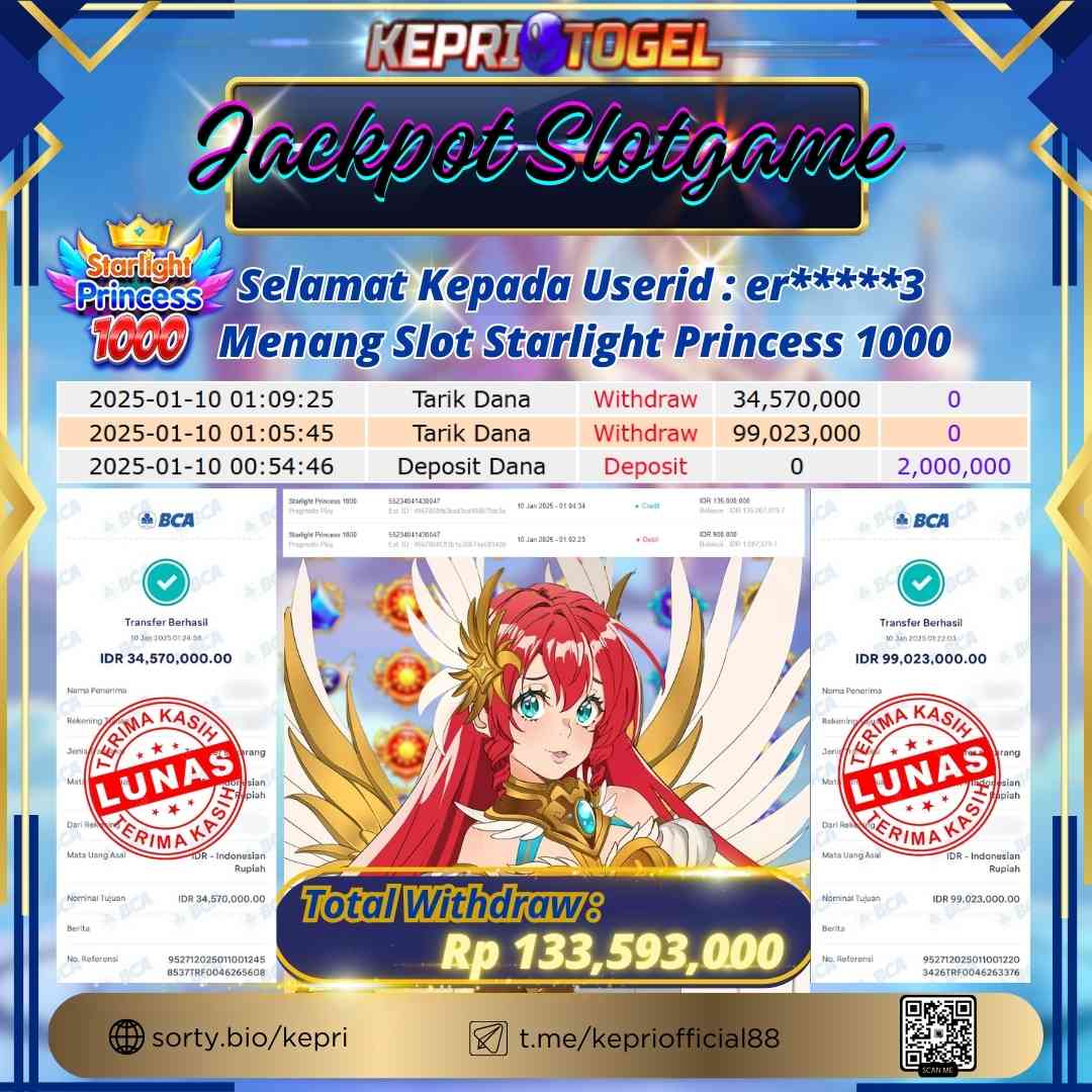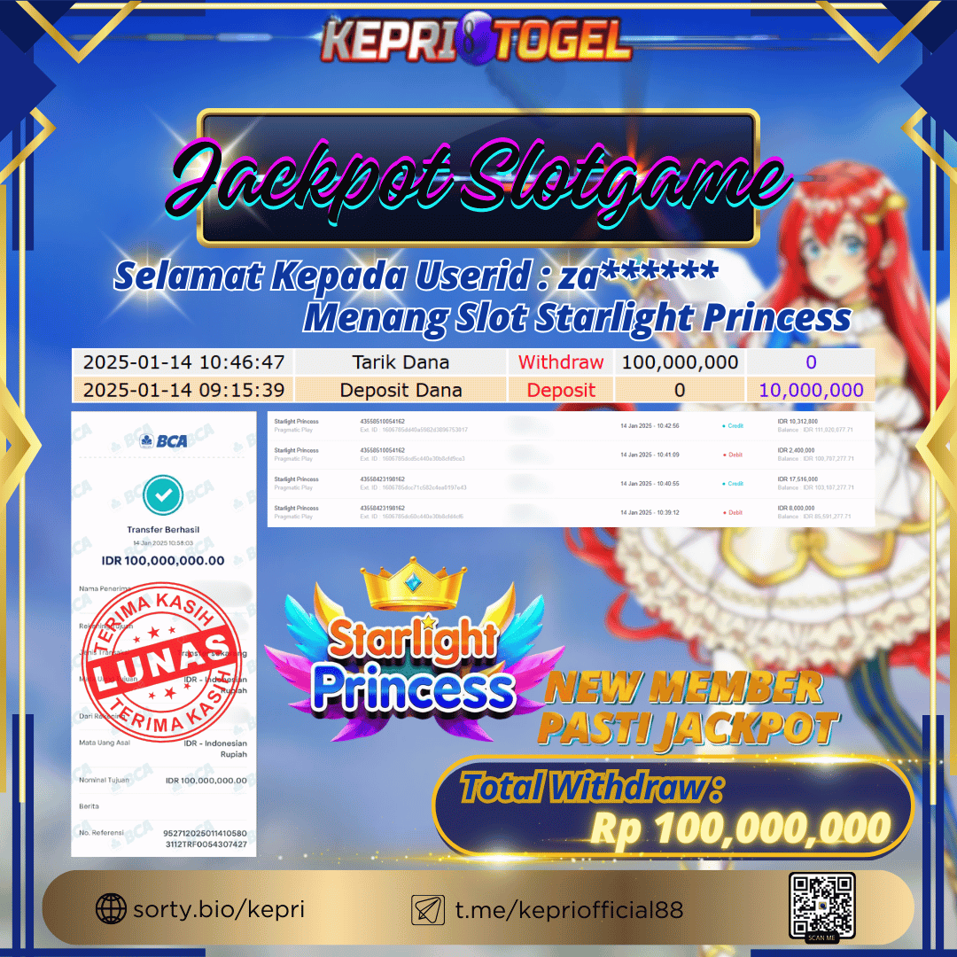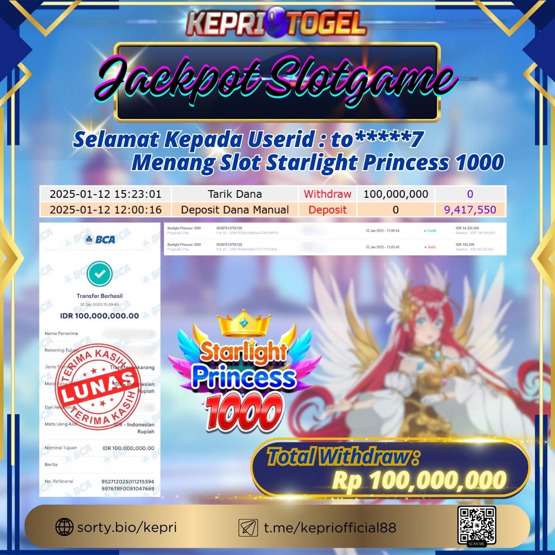 Selamat kepada UserId BU****** telah berhasil mendapatkan kemenangan jackpot pada permainan Slot Starlight Princess 1000 Kepritogel sebesar Rp100,000,000,- . Kepritogel situs terpercaya sejak dulu hingga saat ini , Untuk kemenangan berapapun pasti akan kami bayarkan . Jangan ragu bermain di Kepri Togel . Kami pihak Kepritogel Menyampaikan terima kasih kepada seluruh member Kepri Togel yang telah Percaya dan setia Bersama kami bermain di Kepritogel hingga saat ini.