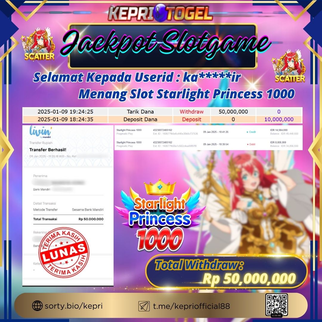 Selamat kepada UserId KA*****IR telah berhasil mendapatkan kemenangan jackpot pada permainan Slot Starlight Princess 1000 Kepritogel sebesar Rp50,000,000,- . Kepritogel situs terpercaya sejak dulu hingga saat ini , Untuk kemenangan berapapun pasti akan kami bayarkan . Jangan ragu bermain di Kepri Togel . Kami pihak Kepritogel Menyampaikan terima kasih kepada seluruh member Kepri Togel yang telah Percaya dan setia Bersama kami bermain di Kepritogel hingga saat ini.