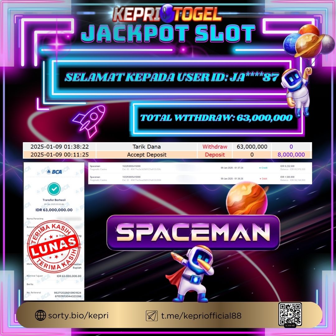 Selamat kepada UserId JA****87 telah berhasil mendapatkan kemenangan jackpot pada permainan Slot SPACEMAN Kepritogel sebesar Rp63,000,000,- . Kepritogel situs terpercaya sejak dulu hingga saat ini , Untuk kemenangan berapapun pasti akan kami bayarkan . Jangan ragu bermain di Kepri Togel . Kami pihak Kepritogel Menyampaikan terima kasih kepada seluruh member Kepri Togel yang telah Percaya dan setia Bersama kami bermain di Kepritogel hingga saat ini.