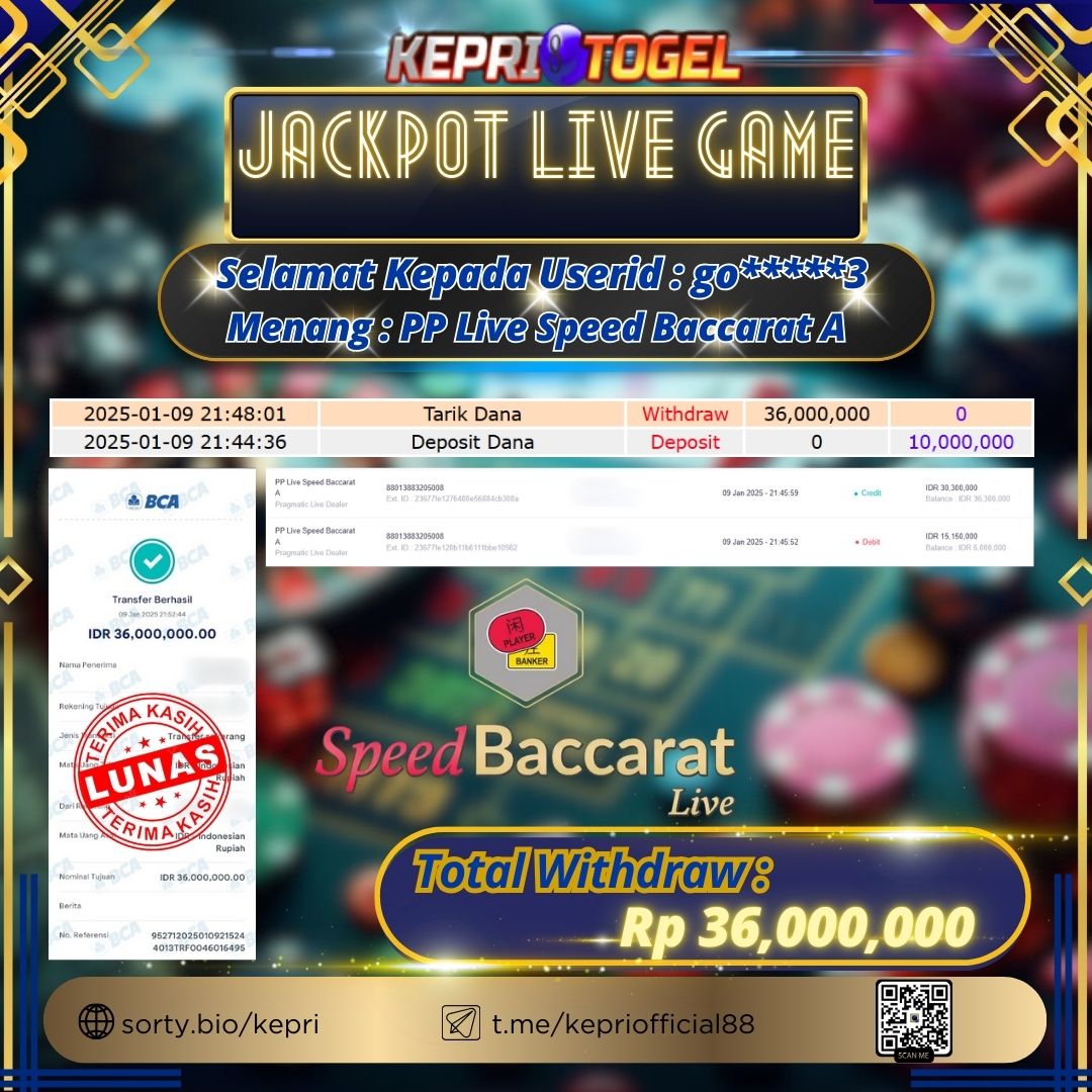 Selamat kepada UserId GO*****3 telah berhasil mendapatkan kemenangan jackpot pada permainan Live Game PP Live Speed Baccarat A Kepritogel sebesar Rp36,000,000,- . Kepritogel situs terpercaya sejak dulu hingga saat ini , Untuk kemenangan berapapun pasti akan kami bayarkan . Jangan ragu bermain di Kepri Togel . Kami pihak Kepritogel Menyampaikan terima kasih kepada seluruh member Kepri Togel yang telah Percaya dan setia Bersama kami bermain di Kepritogel hingga saat inI.