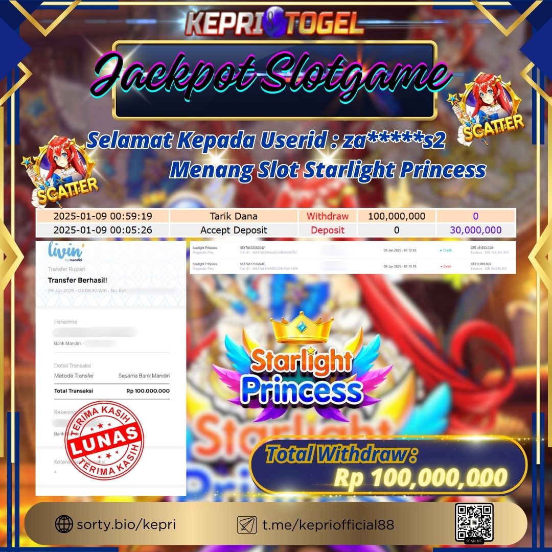 Selamat kepada UserId ZA*****S2 telah berhasil mendapatkan kemenangan jackpot pada permainan Slot Starlight Princess Kepritogel sebesar Rp100,000,000,- . Kepritogel situs terpercaya sejak dulu hingga saat ini , Untuk kemenangan berapapun pasti akan kami bayarkan . Jangan ragu bermain di Kepri Togel . Kami pihak Kepritogel Menyampaikan terima kasih kepada seluruh member Kepri Togel yang telah Percaya dan setia Bersama kami bermain di Kepritogel hingga saat ini.