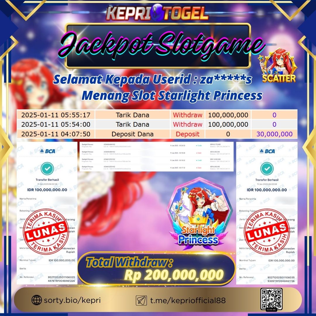 Selamat kepada UserId ZA*****S telah berhasil mendapatkan kemenangan jackpot pada permainan Slot Starlight Princess Kepritogel sebesar Rp200,000,000,- . Kepritogel situs terpercaya sejak dulu hingga saat ini , Untuk kemenangan berapapun pasti akan kami bayarkan . Jangan ragu bermain di Kepri Togel . Kami pihak Kepritogel Menyampaikan terima kasih kepada seluruh member Kepri Togel yang telah Percaya dan setia Bersama kami bermain di Kepritogel hingga saat ini.
