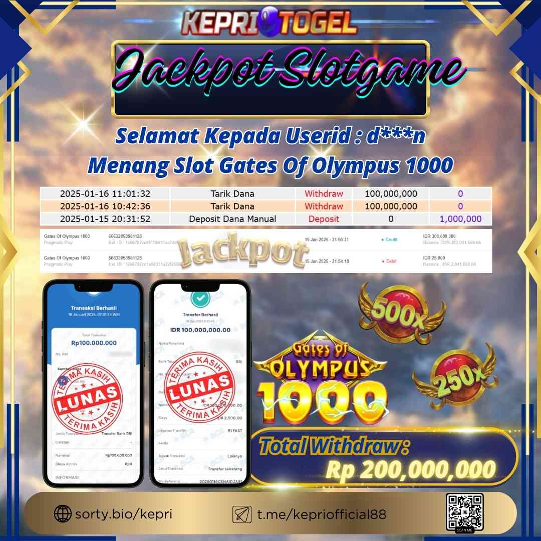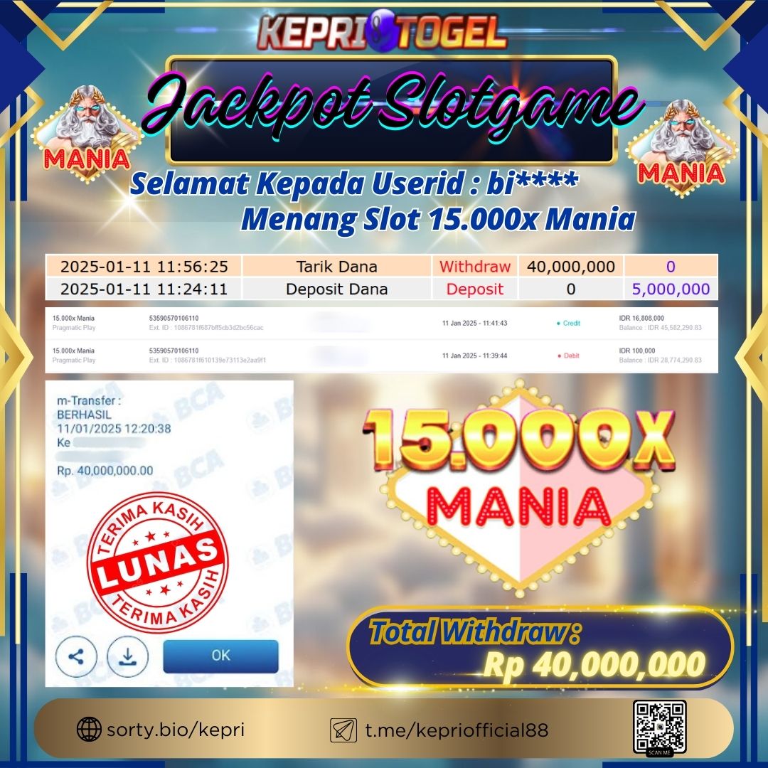 Selamat kepada UserId BI**** telah berhasil mendapatkan kemenangan jackpot pada permainan Slot 15.000x Mania Kepritogel sebesar Rp40,000,000,- . Kepritogel situs terpercaya sejak dulu hingga saat ini , Untuk kemenangan berapapun pasti akan kami bayarkan . Jangan ragu bermain di Kepri Togel . Kami pihak Kepritogel Menyampaikan terima kasih kepada seluruh member Kepri Togel yang telah Percaya dan setia Bersama kami bermain di Kepritogel hingga saat ini.