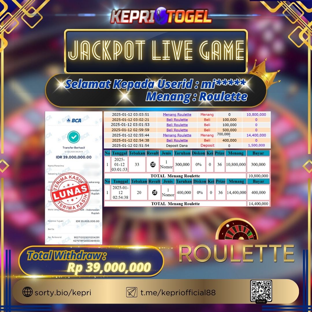 Selamat kepada UserId MI***** telah berhasil mendapatkan kemenangan jackpot pada permainan Live Game Roulette Kepritogel sebesar Rp39,000,000,- . Kepritogel situs terpercaya sejak dulu hingga saat ini , Untuk kemenangan berapapun pasti akan kami bayarkan . Jangan ragu bermain di Kepri Togel . Kami pihak Kepritogel Menyampaikan terima kasih kepada seluruh member Kepri Togel yang telah Percaya dan setia Bersama kami bermain di Kepritogel hingga saat inI.