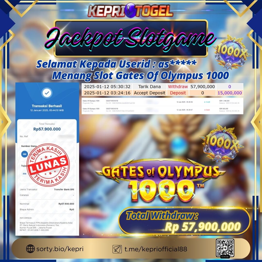 Selamat kepada UserId AS***** telah berhasil mendapatkan kemenangan jackpot pada permainan Slot Gates Of Olympus 1000 Kepritogel sebesar Rp57,900,000,- . Kepritogel situs terpercaya sejak dulu hingga saat ini , Untuk kemenangan berapapun pasti akan kami bayarkan . Jangan ragu bermain di Kepri Togel . Kami pihak Kepritogel Menyampaikan terima kasih kepada seluruh member Kepri Togel yang telah Percaya dan setia Bersama kami bermain di Kepritogel hingga saat ini.