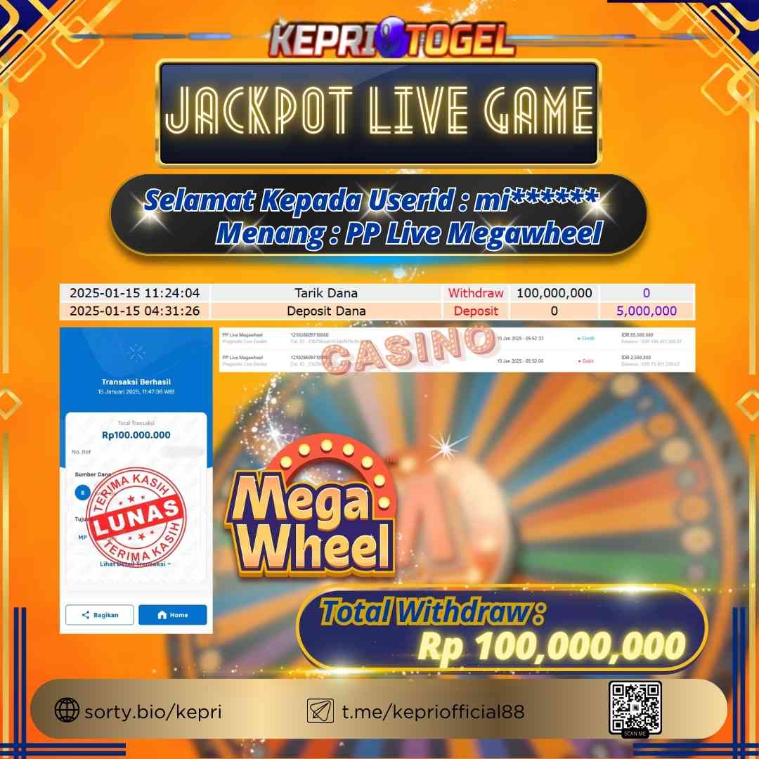 Selamat kepada UserId MI****** telah berhasil mendapatkan kemenangan jackpot pada permainan Live Game Megawheel Kepritogel sebesar Rp100,000,000,- . Kepritogel situs terpercaya sejak dulu hingga saat ini , Untuk kemenangan berapapun pasti akan kami bayarkan . Jangan ragu bermain di Kepri Togel . Kami pihak Kepritogel Menyampaikan terima kasih kepada seluruh member Kepri Togel yang telah Percaya dan setia Bersama kami bermain di Kepritogel hingga saat inI.