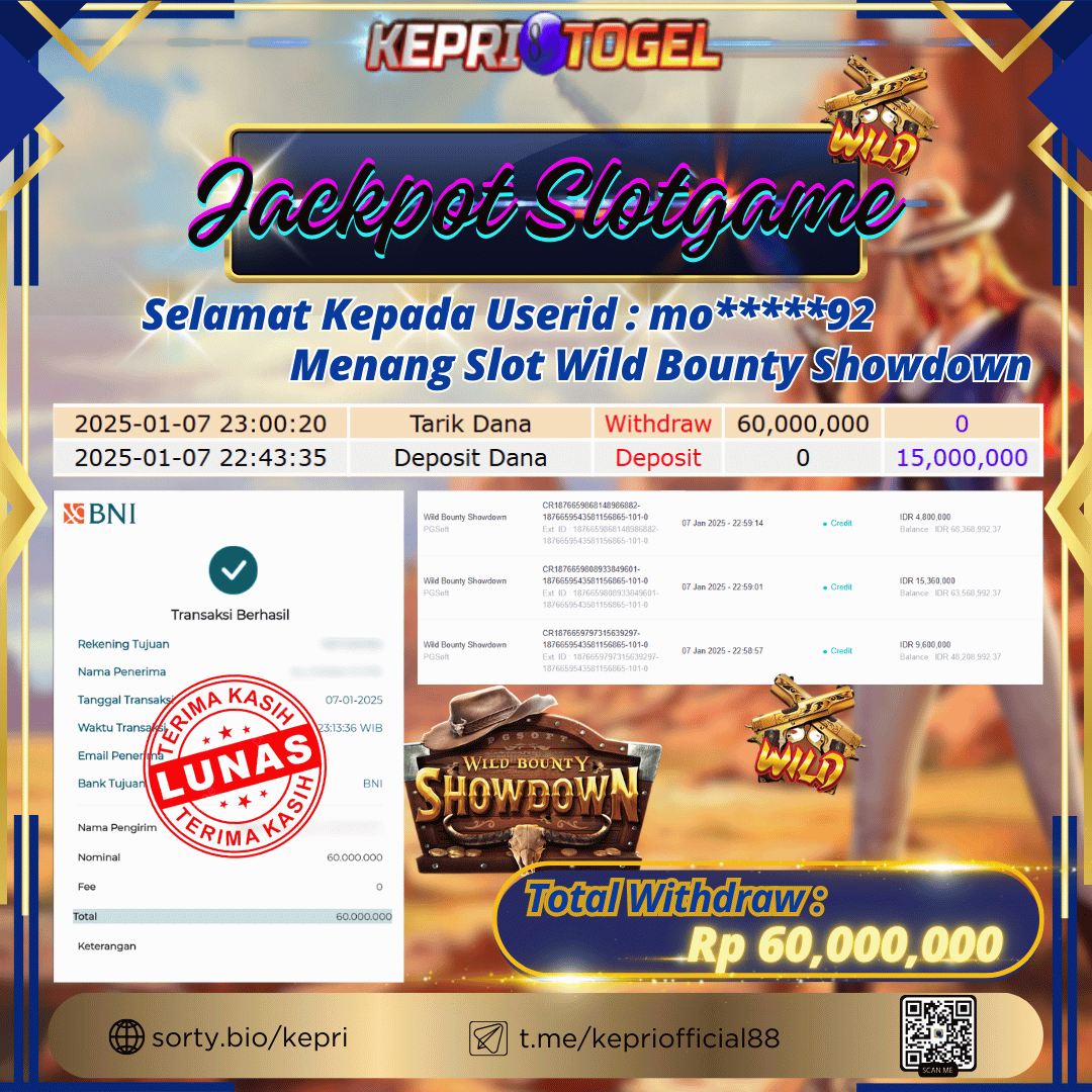 Selamat kepada UserId MO*****92 telah berhasil mendapatkan kemenangan jackpot pada permainan Slot Game Wild Bounty Showdown Kepritogel sebesar Rp60,000,000,- . Kepritogel situs terpercaya sejak dulu hingga saat ini , Untuk kemenangan berapapun pasti akan kami bayarkan . Jangan ragu bermain di Kepri Togel . Kami pihak Kepritogel Menyampaikan terima kasih kepada seluruh member Kepri Togel yang telah Percaya dan setia Bersama kami bermain di Kepritogel hingga saat ini.