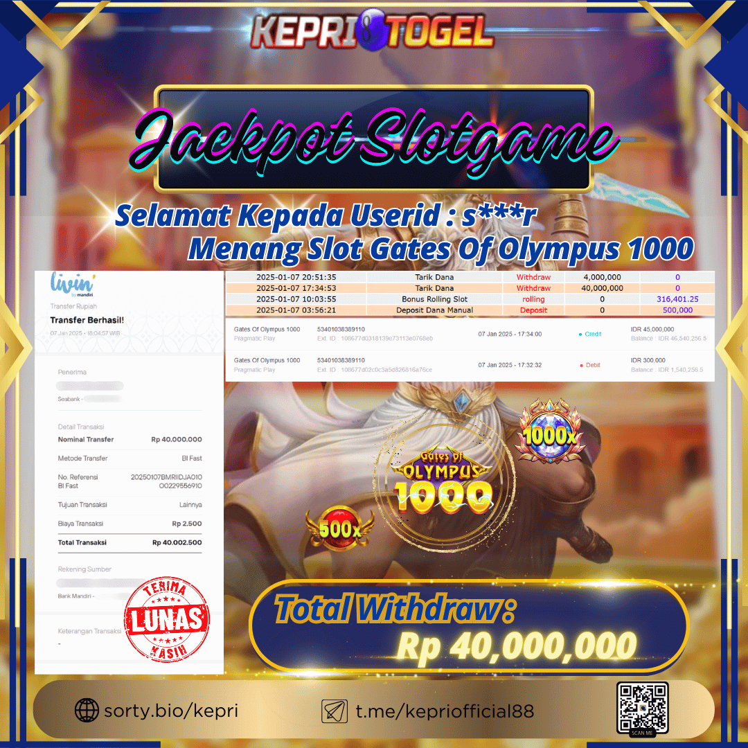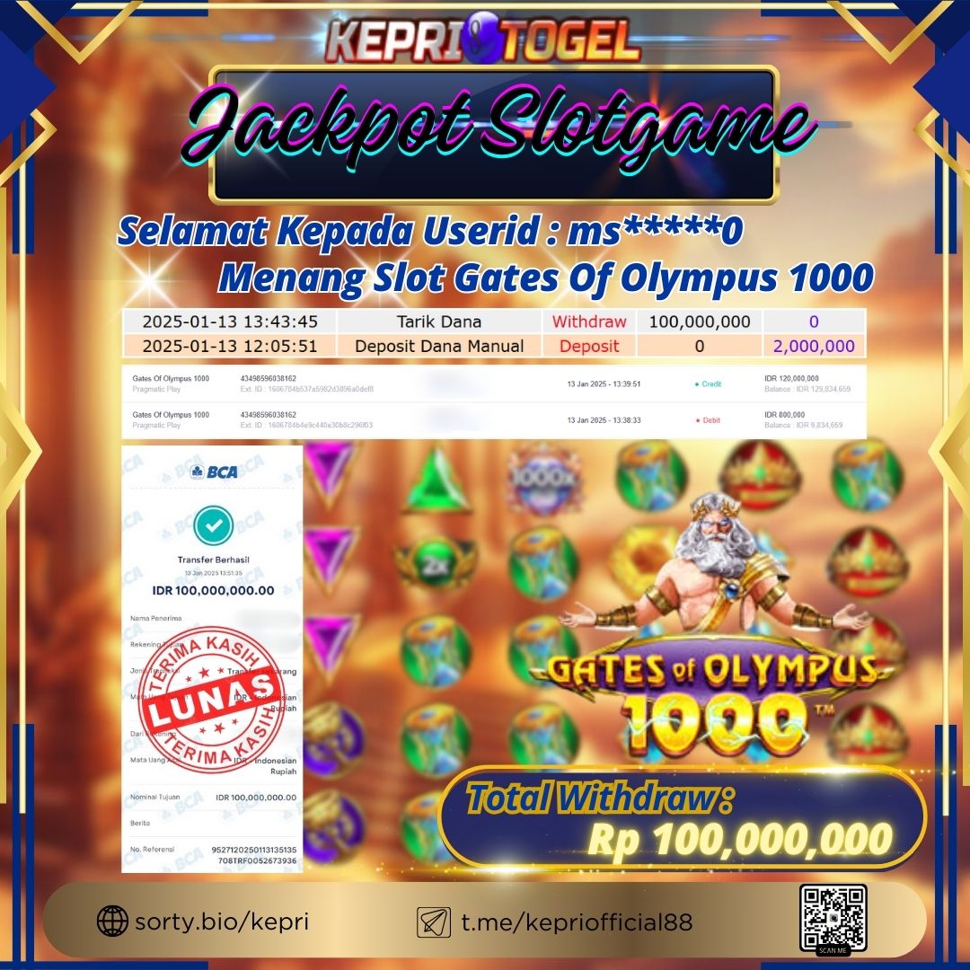 Selamat kepada UserId S***R telah berhasil mendapatkan kemenangan jackpot pada permainan Slot Gates Of Olympus 1000 Kepritogel sebesar Rp40,000,000,- . Kepritogel situs terpercaya sejak dulu hingga saat ini , Untuk kemenangan berapapun pasti akan kami bayarkan . Jangan ragu bermain di Kepri Togel . Kami pihak Kepritogel Menyampaikan terima kasih kepada seluruh member Kepri Togel yang telah Percaya dan setia Bersama kami bermain di Kepritogel hingga saat ini.