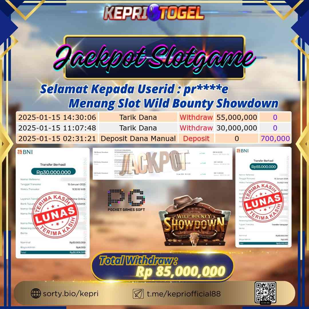 Selamat kepada UserId Pr****e telah berhasil mendapatkan kemenangan jackpot pada permainan Slot Game Wild Bounty Showdown Kepritogel sebesar Rp85,000,000,- . Kepritogel situs terpercaya sejak dulu hingga saat ini , Untuk kemenangan berapapun pasti akan kami bayarkan . Jangan ragu bermain di Kepri Togel . Kami pihak Kepritogel Menyampaikan terima kasih kepada seluruh member Kepri Togel yang telah Percaya dan setia Bersama kami bermain di Kepritogel hingga saat ini.
