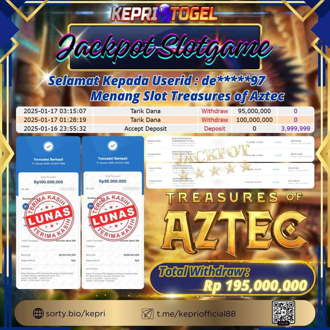 Selamat kepada UserId DE*****97 telah berhasil mendapatkan kemenangan jackpot pada permainan Slot Treasures of Aztec Kepritogel sebesar Rp195,000,000,- . Kepritogel situs terpercaya sejak dulu hingga saat ini , Untuk kemenangan berapapun pasti akan kami bayarkan . Jangan ragu bermain di Kepri Togel . Kami pihak Kepritogel Menyampaikan terima kasih kepada seluruh member Kepri Togel yang telah Percaya dan setia Bersama kami bermain di Kepritogel hingga saat ini.