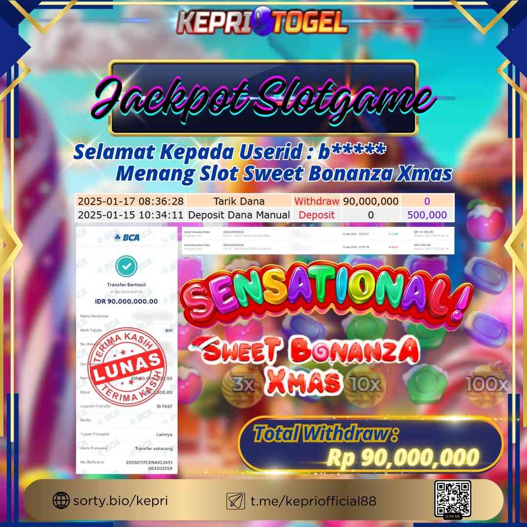 Selamat kepada UserId B***** telah berhasil mendapatkan kemenangan jackpot pada permainan Slot Sweet Bonanza Xmas Kepritogel sebesar Rp90,000,000,- . Kepritogel situs terpercaya sejak dulu hingga saat ini , Untuk kemenangan berapapun pasti akan kami bayarkan . Jangan ragu bermain di Kepri Togel . Kami pihak Kepritogel Menyampaikan terima kasih kepada seluruh member Kepri Togel yang telah Percaya dan setia Bersama kami bermain di Kepritogel hingga saat ini.