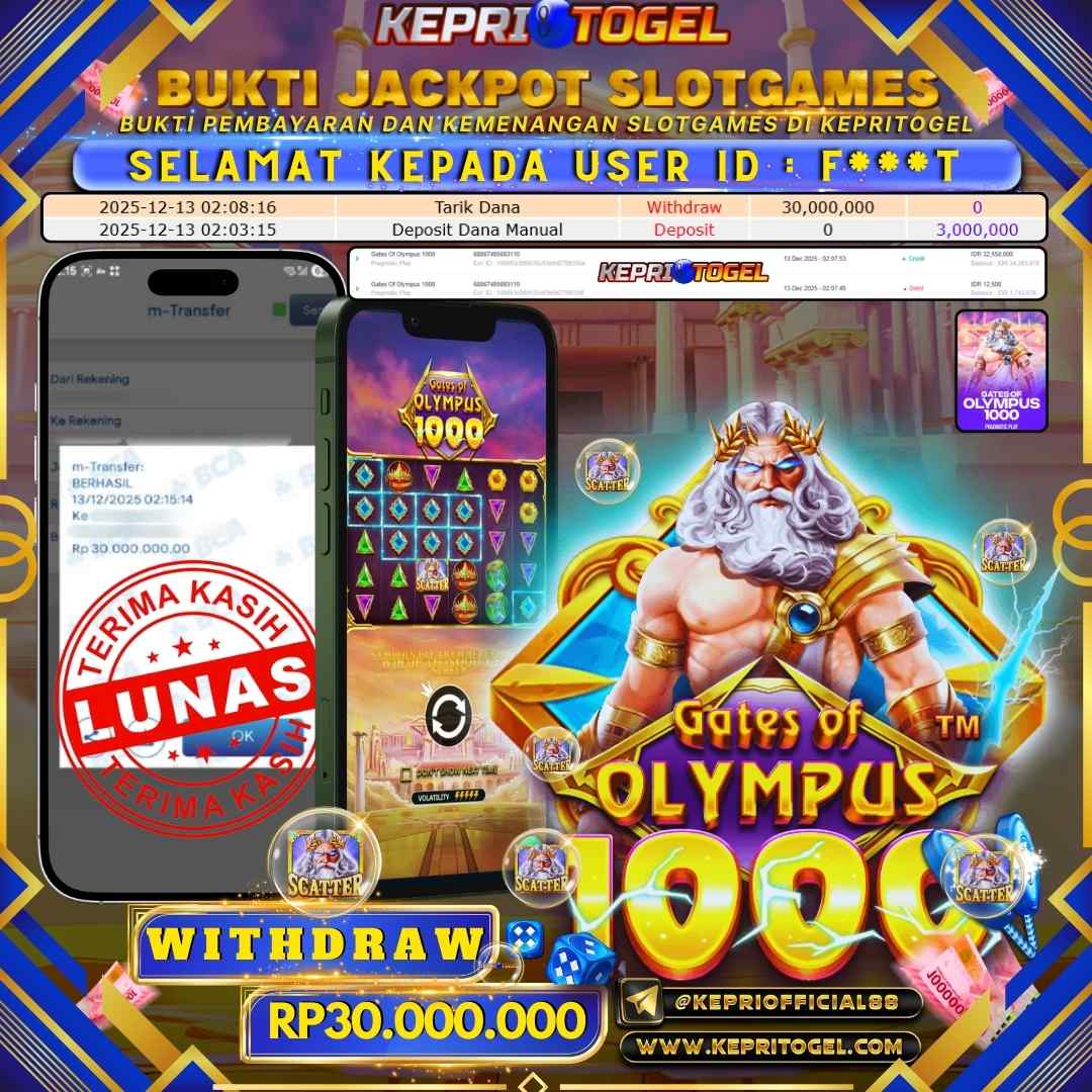Selamat kepada UserId F***T telah berhasil mendapatkan kemenangan jackpot pada permainan Slot Gates Of Olympus 1000 Kepritogel sebesar Rp30,000,000,- . Kepritogel situs terpercaya sejak dulu hingga saat ini , Untuk kemenangan berapapun pasti akan kami bayarkan . Jangan ragu bermain di Kepri Togel . Kami pihak Kepritogel Menyampaikan terima kasih kepada seluruh member Kepri Togel yang telah Percaya dan setia Bersama kami bermain di Kepritogel hingga saat ini.