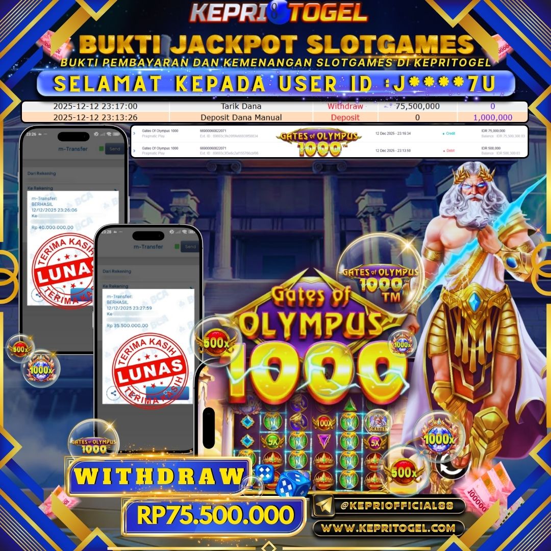 Selamat kepada UserId J****7U telah berhasil mendapatkan kemenangan jackpot pada permainan Slot Gates Of Olympus 1000 Kepritogel sebesar Rp75,500,000,- . Kepritogel situs terpercaya sejak dulu hingga saat ini , Untuk kemenangan berapapun pasti akan kami bayarkan . Jangan ragu bermain di Kepri Togel . Kami pihak Kepritogel Menyampaikan terima kasih kepada seluruh member Kepri Togel yang telah Percaya dan setia Bersama kami bermain di Kepritogel hingga saat ini.