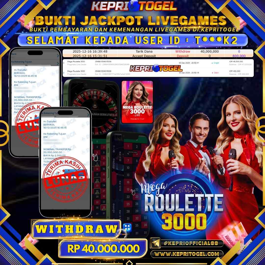 Selamat kepada UserId T***K2 telah berhasil mendapatkan kemenangan jackpot pada permainan Live Game Mega Roulette 3000 Kepritogel sebesar Rp40,000,000,- . Kepritogel situs terpercaya sejak dulu hingga saat ini , Untuk kemenangan berapapun pasti akan kami bayarkan . Jangan ragu bermain di Kepri Togel . Kami pihak Kepritogel Menyampaikan terima kasih kepada seluruh member Kepri Togel yang telah Percaya dan setia Bersama kami bermain di Kepritogel hingga saat ini.