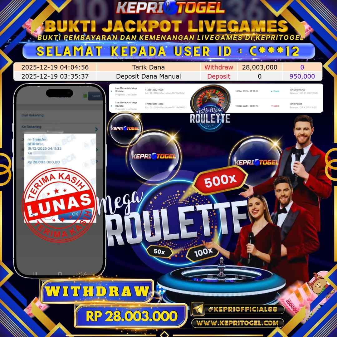 Selamat kepada UserId C***12 telah berhasil mendapatkan kemenangan jackpot pada permainan Live Game Mania Auto Mega Roullete Kepritogel sebesar Rp28,003,000,- . Kepritogel situs terpercaya sejak dulu hingga saat ini , Untuk kemenangan berapapun pasti akan kami bayarkan . Jangan ragu bermain di Kepri Togel . Kami pihak Kepritogel Menyampaikan terima kasih kepada seluruh member Kepri Togel yang telah Percaya dan setia Bersama kami bermain di Kepritogel hingga saat ini.
