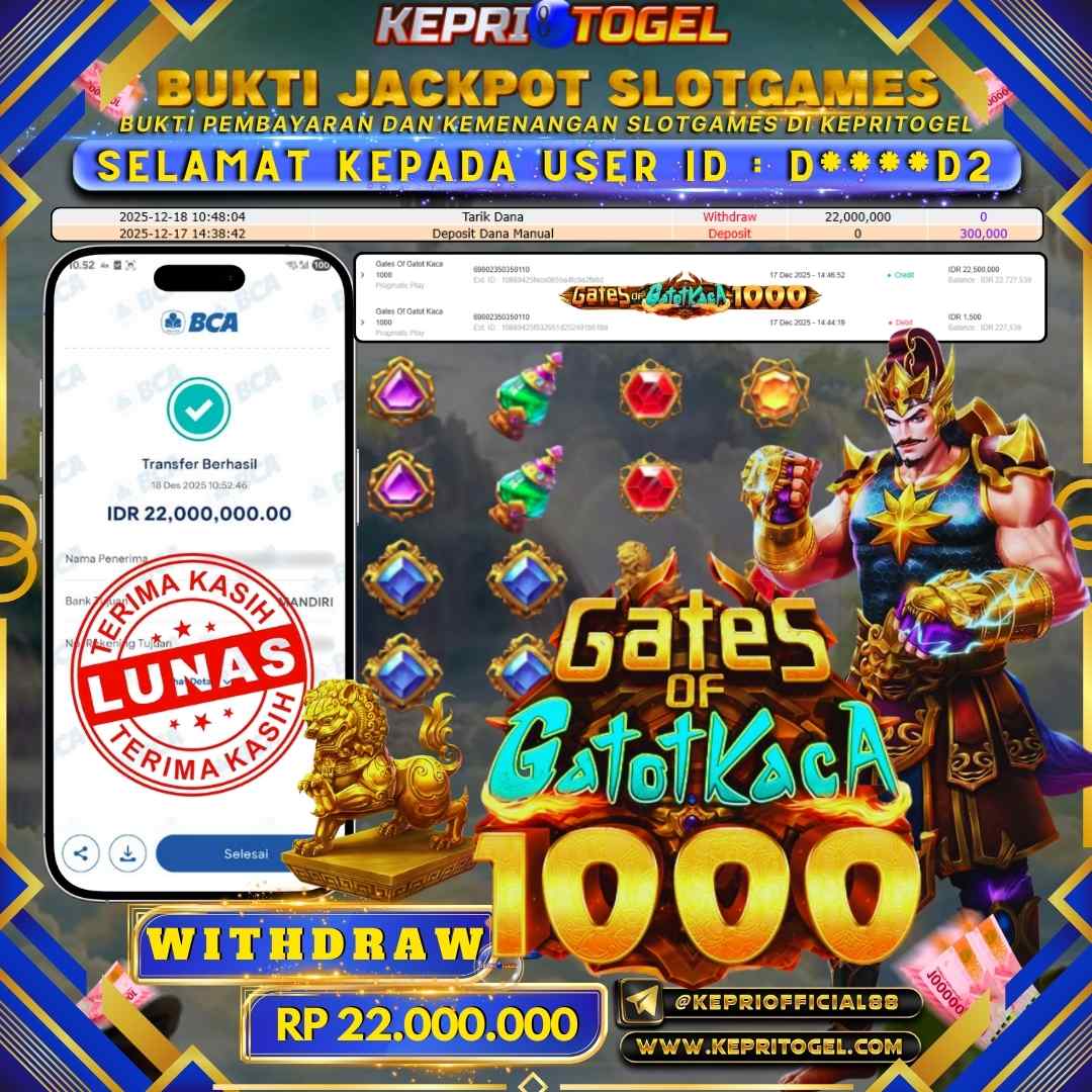 Selamat kepada UserId D****D2 telah berhasil mendapatkan kemenangan jackpot pada permainan Slot Gates Of Gatot Kaca 1000 Kepritogel sebesar Rp22,000,000,- . Kepritogel situs terpercaya sejak dulu hingga saat ini , Untuk kemenangan berapapun pasti akan kami bayarkan . Jangan ragu bermain di Kepri Togel . Kami pihak Kepritogel Menyampaikan terima kasih kepada seluruh member Kepri Togel yang telah Percaya dan setia Bersama kami bermain di Kepritogel hingga saat ini.