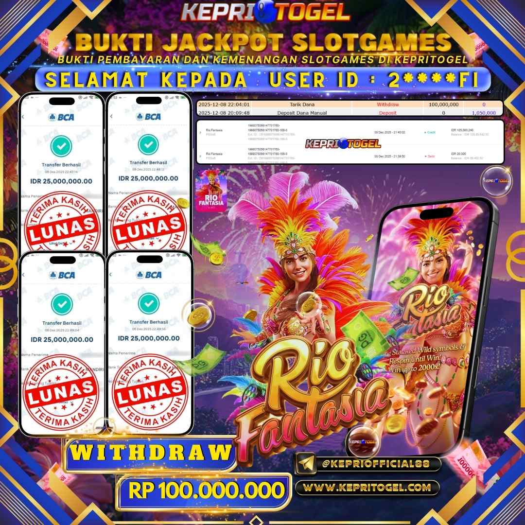 Selamat kepada UserId 2****FI telah berhasil mendapatkan kemenangan jackpot pada permainan Slot Rio Fantasia Kepritogel sebesar Rp100,000,000,- . Kepritogel situs terpercaya sejak dulu hingga saat ini , Untuk kemenangan berapapun pasti akan kami bayarkan . Jangan ragu bermain di Kepri Togel . Kami pihak Kepritogel Menyampaikan terima kasih kepada seluruh member Kepri Togel yang telah Percaya dan setia Bersama kami bermain di Kepritogel hingga saat ini.