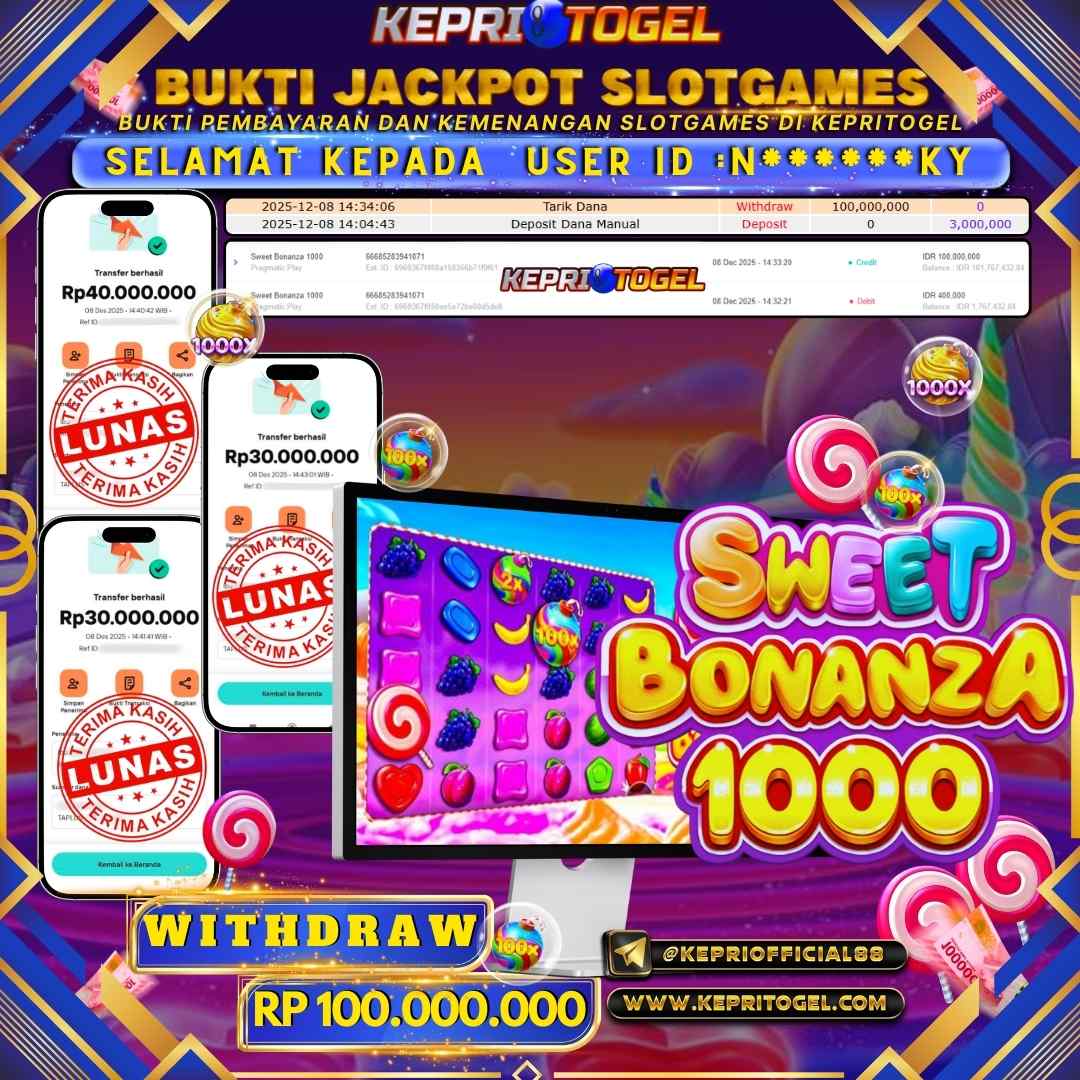 Selamat kepada UserId N******KY telah berhasil mendapatkan kemenangan jackpot pada permainan Slot Sweet Bonanza 1000 Kepritogel sebesar Rp100,000,000,- . Kepritogel situs terpercaya sejak dulu hingga saat ini , Untuk kemenangan berapapun pasti akan kami bayarkan . Jangan ragu bermain di Kepri Togel . Kami pihak Kepritogel Menyampaikan terima kasih kepada seluruh member Kepri Togel yang telah Percaya dan setia Bersama kami bermain di Kepritogel hingga saat ini.