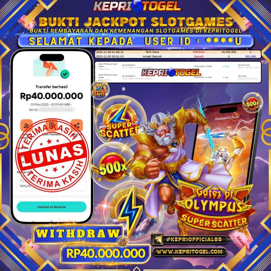 Selamat kepada UserId ****U telah berhasil mendapatkan kemenangan jackpot pada permainan Slot Gates Of Olympus Super Scatter Kepritogel sebesar Rp40,000,000,- . Kepritogel situs terpercaya sejak dulu hingga saat ini , Untuk kemenangan berapapun pasti akan kami bayarkan . Jangan ragu bermain di Kepri Togel . Kami pihak Kepritogel Menyampaikan terima kasih kepada seluruh member Kepri Togel yang telah Percaya dan setia Bersama kami bermain di Kepritogel hingga saat ini.