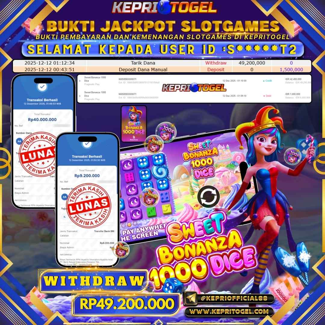 Selamat kepada UserId S*****T2 telah berhasil mendapatkan kemenangan jackpot pada permainan Slot Sweet Bonanza 1000 Dice Kepritogel sebesar Rp49,200,000,- . Kepritogel situs terpercaya sejak dulu hingga saat ini , Untuk kemenangan berapapun pasti akan kami bayarkan . Jangan ragu bermain di Kepri Togel . Kami pihak Kepritogel Menyampaikan terima kasih kepada seluruh member Kepri Togel yang telah Percaya dan setia Bersama kami bermain di Kepritogel hingga saat ini.