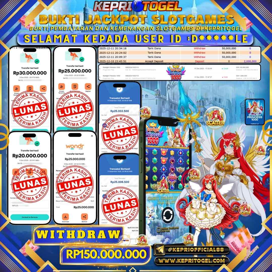 Selamat kepada UserId D*****LE telah berhasil mendapatkan kemenangan jackpot pada permainan Slot Starlight Princess 1000 Kepritogel sebesar Rp150,000,000,- . Kepritogel situs terpercaya sejak dulu hingga saat ini , Untuk kemenangan berapapun pasti akan kami bayarkan . Jangan ragu bermain di Kepri Togel . Kami pihak Kepritogel Menyampaikan terima kasih kepada seluruh member Kepri Togel yang telah Percaya dan setia Bersama kami bermain di Kepritogel hingga saat ini.