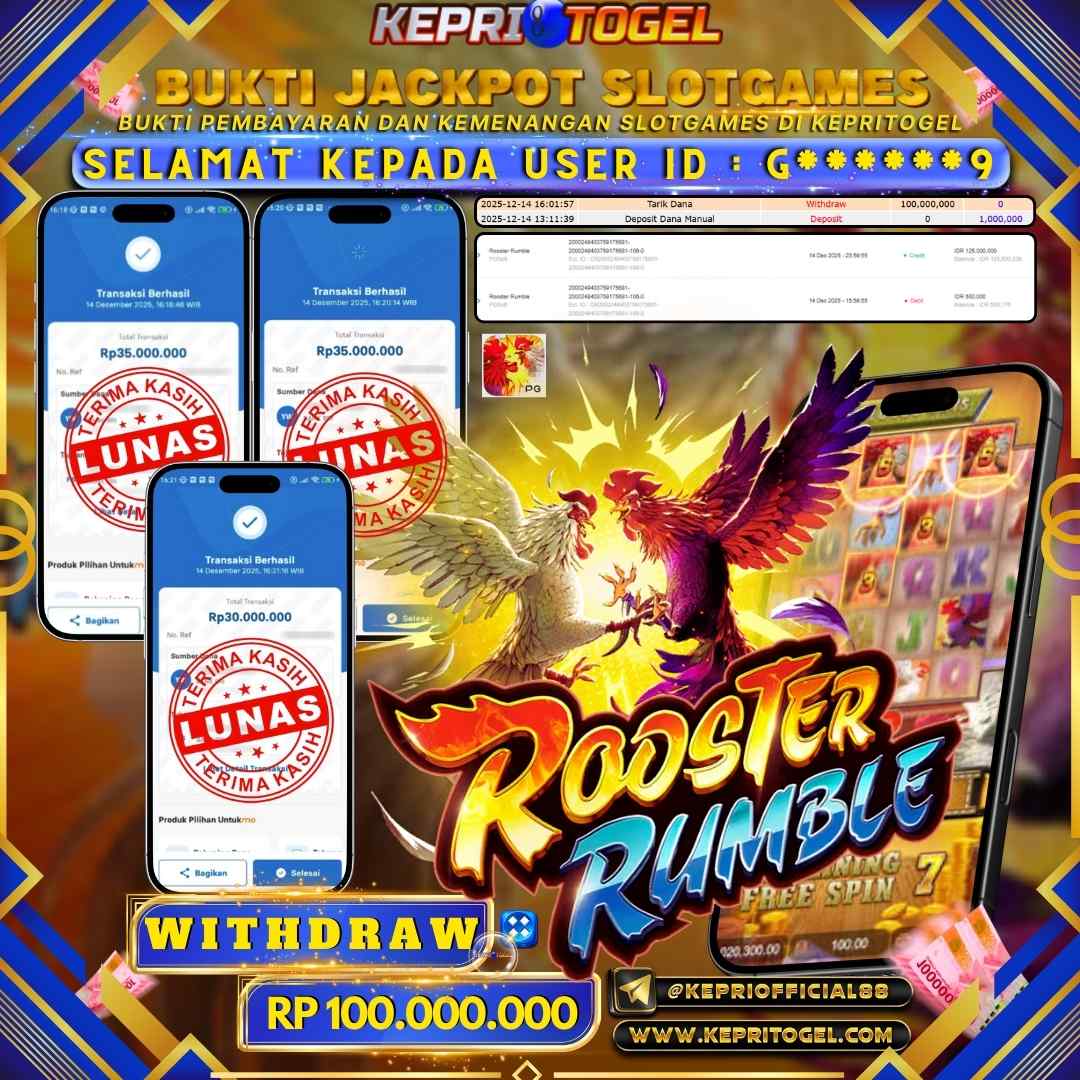 Selamat kepada UserId G******9 telah berhasil mendapatkan kemenangan jackpot pada permainan Slot Rooster Rumble Kepritogel sebesar Rp100,000,000,- . Kepritogel situs terpercaya sejak dulu hingga saat ini , Untuk kemenangan berapapun pasti akan kami bayarkan . Jangan ragu bermain di Kepri Togel . Kami pihak Kepritogel Menyampaikan terima kasih kepada seluruh member Kepri Togel yang telah Percaya dan setia Bersama kami bermain di Kepritogel hingga saat ini.