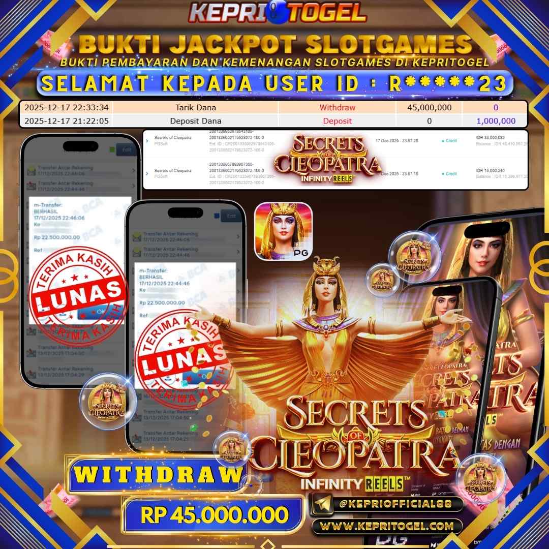 Selamat kepada UserId R*****23 telah berhasil mendapatkan kemenangan jackpot pada permainan Slot Secrets Cleopatra Kepritogel sebesar Rp45,000,000,- . Kepritogel situs terpercaya sejak dulu hingga saat ini , Untuk kemenangan berapapun pasti akan kami bayarkan . Jangan ragu bermain di Kepri Togel . Kami pihak Kepritogel Menyampaikan terima kasih kepada seluruh member Kepri Togel yang telah Percaya dan setia Bersama kami bermain di Kepritogel hingga saat ini.