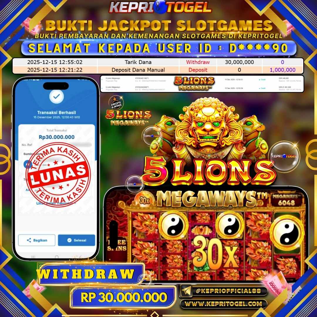 Selamat kepada UserId D****90 telah berhasil mendapatkan kemenangan jackpot pada permainan Slot 5 Lions Megaways Kepritogel sebesar Rp30,000,000,- . Kepritogel situs terpercaya sejak dulu hingga saat ini , Untuk kemenangan berapapun pasti akan kami bayarkan . Jangan ragu bermain di Kepri Togel . Kami pihak Kepritogel Menyampaikan terima kasih kepada seluruh member Kepri Togel yang telah Percaya dan setia Bersama kami bermain di Kepritogel hingga saat ini.