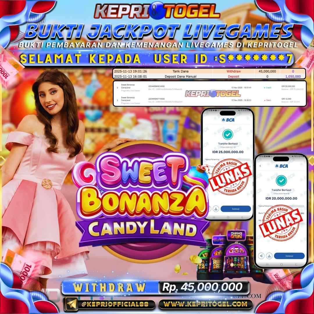 Selamat kepada UserId S*******7 telah berhasil mendapatkan kemenangan jackpot pada permainan Live Game Sweet Bonanza Candyland Kepritogel sebesar Rp45,000,000,- . Kepritogel situs terpercaya sejak dulu hingga saat ini , Untuk kemenangan berapapun pasti akan kami bayarkan . Jangan ragu bermain di Kepri Togel . Kami pihak Kepritogel Menyampaikan terima kasih kepada seluruh member Kepri Togel yang telah Percaya dan setia Bersama kami bermain di Kepritogel hingga saat ini.