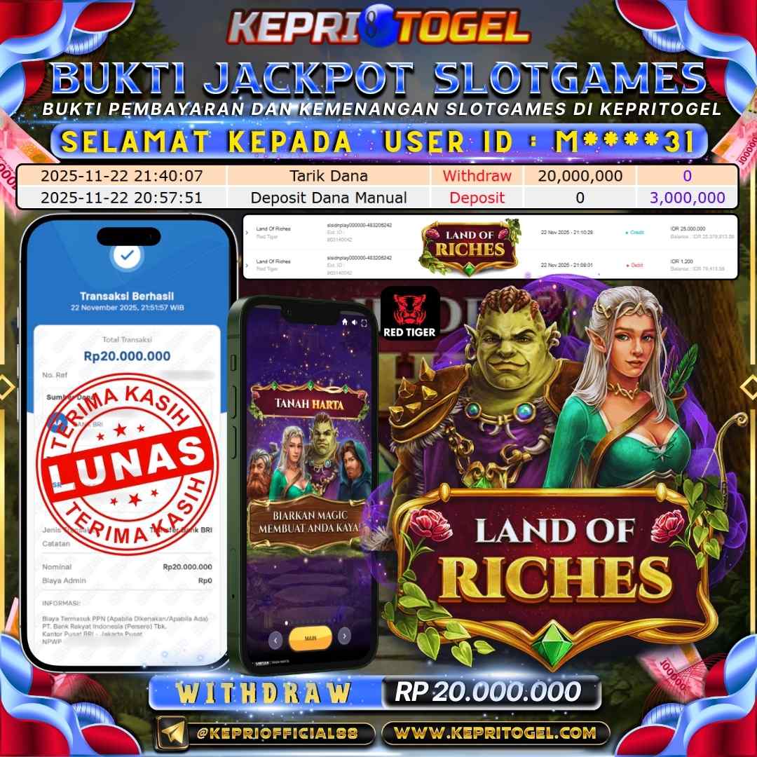 Kepritogel Jackpot Slot Land of Riches Rp20,000,000