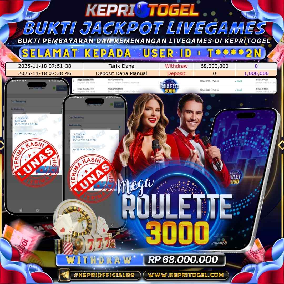 Kepritogel Jackpot Live Game Mega Roulette 3000 Rp68,000,000